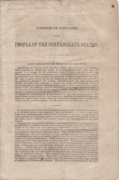 Confederate imprint, Address of Congress to the People of the Confederate States, Richmond, 1864, 8pp. 8vo., (P&W #228). In this address by J. L. M. Curry to both houses, Southerners were reminded that the war was not going well, and attempted to reinforce in them the ideals for which they were fighting and what types of people they were fighting against in their "struggle for the preservation of Liberty and Civilization; and that no sacrifice of life or fortune can be too costly...". The election of Lincoln is also mention, a culmination of a "long series of oppressive and tyrannical acts". Congress exhorts citizens to offer their "generous and hearty co-operation" to help eliminate the "presence of our cruel foe". Signed in type at conclusion by all members of Congress.