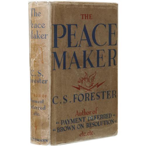 <B>C. S. Forester: <I>The Peacemaker</B></I>.</B></I> (London: William Heinemann Ltd., 1934), first edition, 341 pages, bound in green boards with gilt title on spine, 12mo (5" x 7.5"), dust jacket present, unclipped (7/6). A great science fiction novel from a prolific British author best known for his forays into action-adventure with books such as <I>The African Queen</B></I> and the Horatio Hornblower series. <B>Condition</B></I>: Wear and toning to dj, else good. Foxing on edges of book, else very good. <I>From the Ventura Collection.</B></I><BR><BR><b>Shipping:</b> Books & Catalogs (<a target="_blank" href="http://www.heritageauctions.com/common/shipping.php">view shipping information</a>)