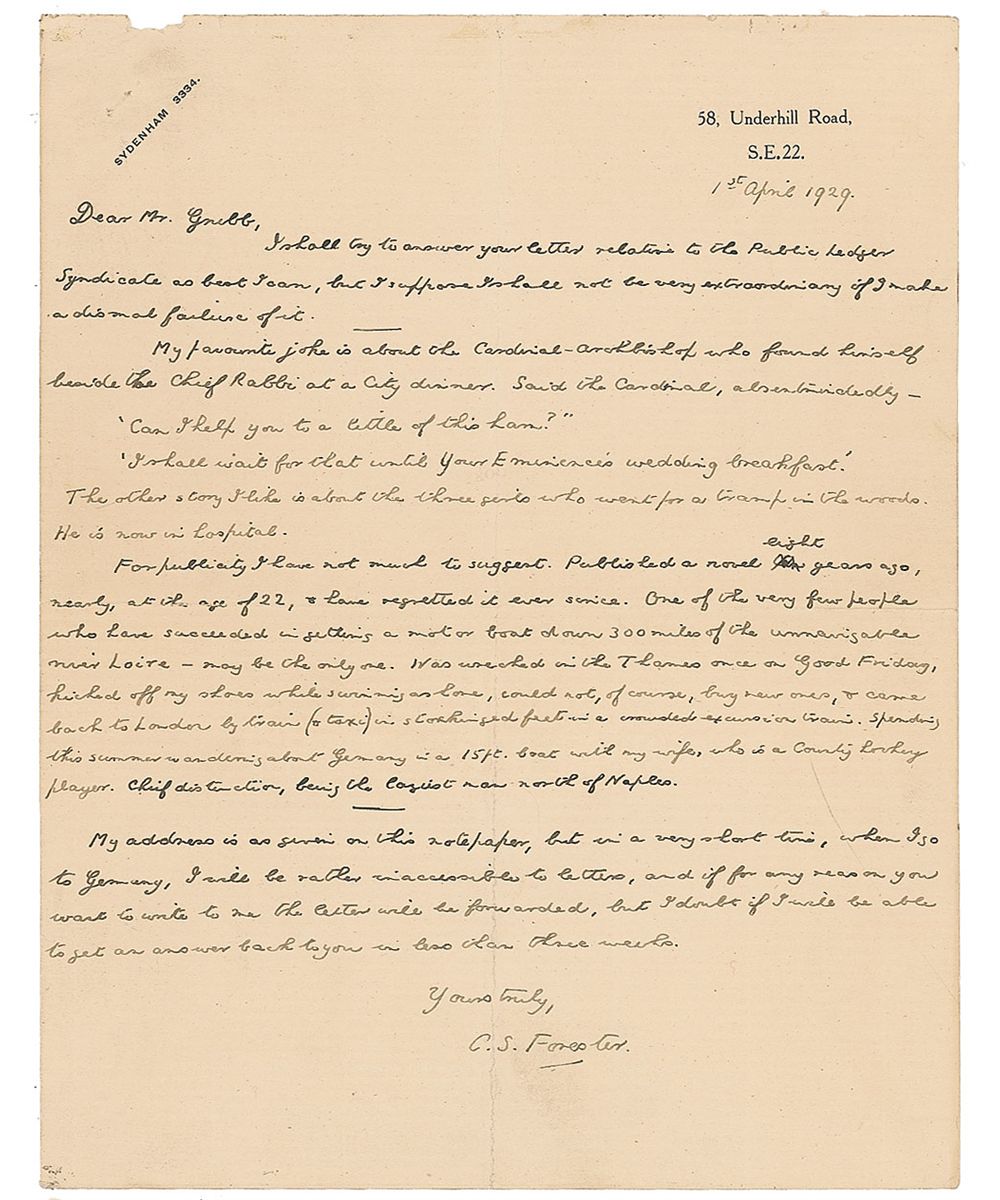 British novelist (1899–1966) best known for the Horatio Hornblower series and The African Queen, the most famous of his books adapted for the screen. ALS, one page, 7 x 9, personal letterhead, April 1, 1929. Letter to Mr. Grubb of the Philadelphia Public Ledger Syndicate. In part: “For publicity I have not much to suggest. Published a novel eight years ago, nearly, at the age of 22, & have regretted it ever since. One of the very few people who have succeeded in getting a motor boat down 300 miles of the unnavigable river Loire—may be the only one. Was wrecked in the Thames once on Good Friday, kicked off my shoes while swimming ashore, could not, of course, buy new ones, & came back to London by train (& taxi) in stockinged feet in a crowded excursion train.” Central vertical and horizontal folds (slight separation to right edge of horizontal fold), and slight paper loss to the upper left, otherwise fine condition.