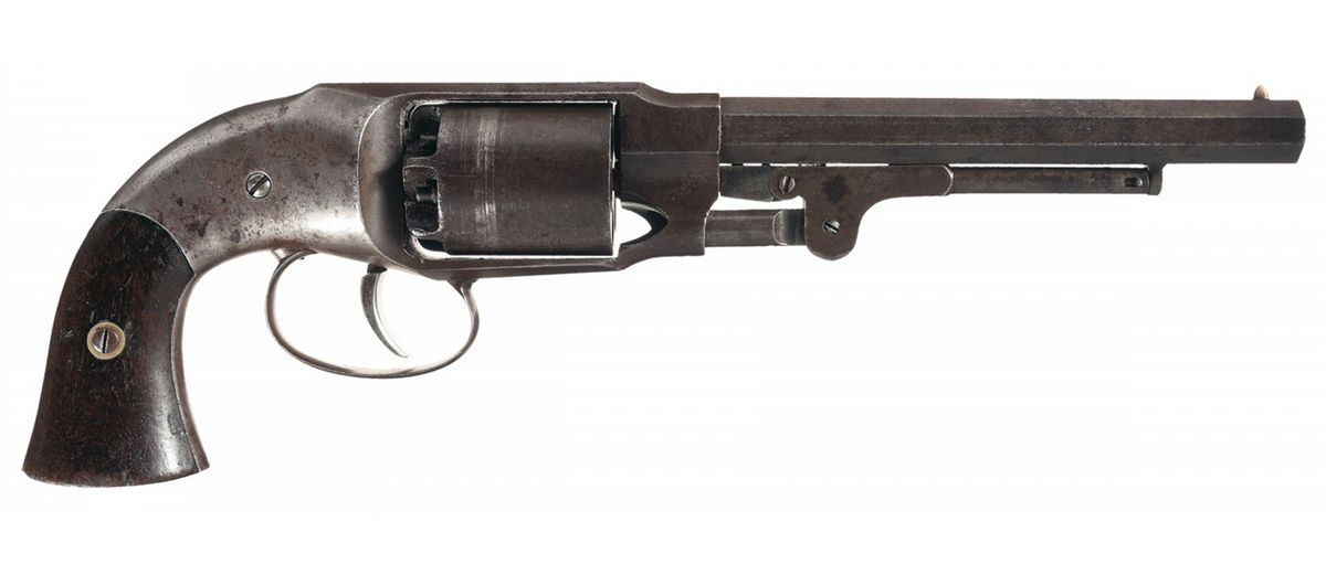 This is a scarce Pettengill double action revolver with 3,400 manufactured in the early 1860s. The top strap is marked with the two line Pettengill 1856 patent date and two line Raymond & Robitaille marking around the sight groove. The cylinder, trigger guard and both grips are numbered to the gun.