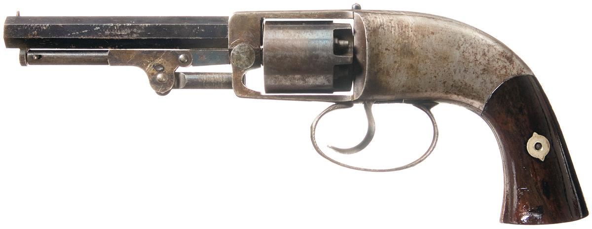 Brass cone front and screw groove rear sights, with "PETTENGILL'S / PATENT 1856" on top of the frame and "RAYMOND & ROBITALLE/ PATENTED 1858" on bottom. The frame, trigger guard and barrel are numbered "494", loading lever numbered "344" and cylinder numbered "331". Smooth 2-piece grips, with silver screw escutcheons. With notes from the consignor
