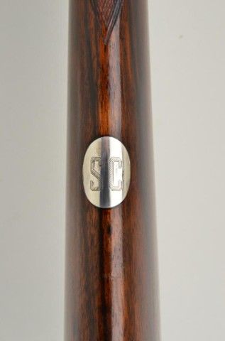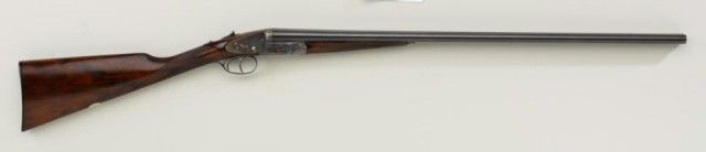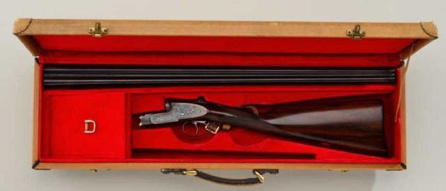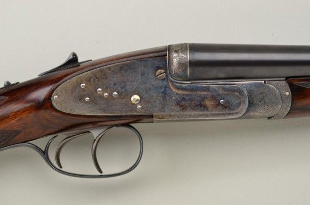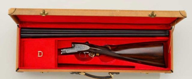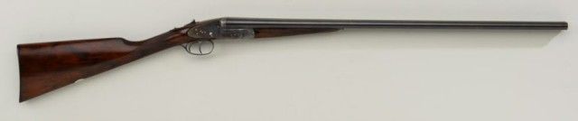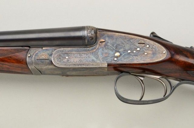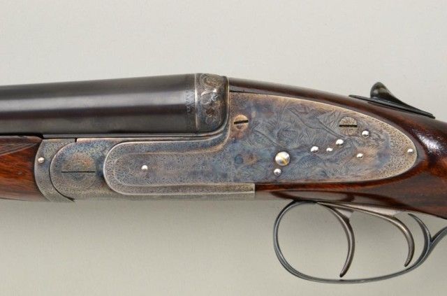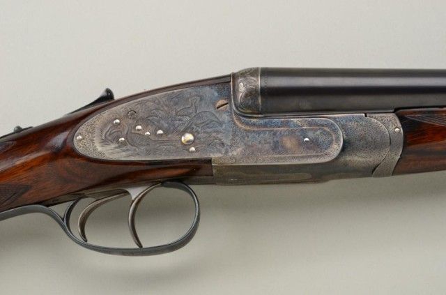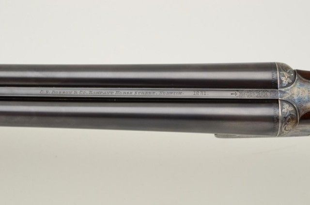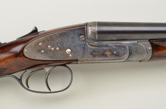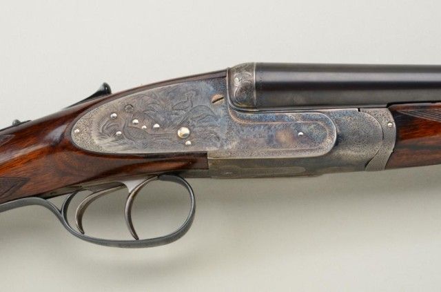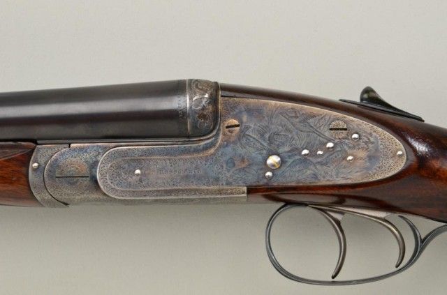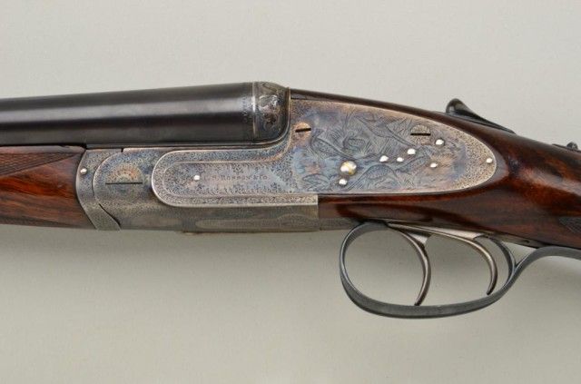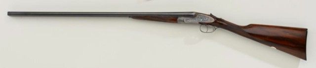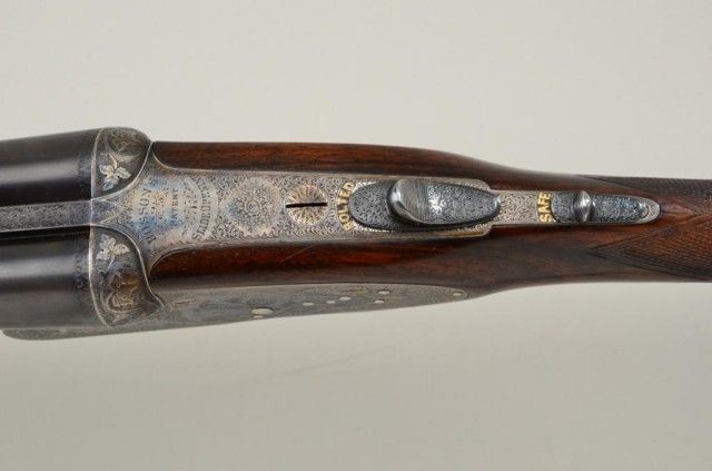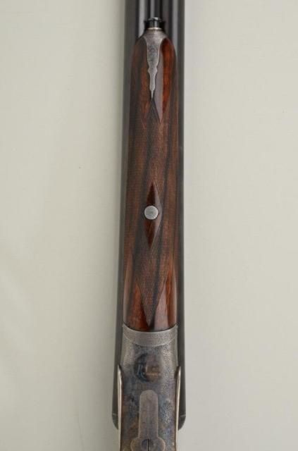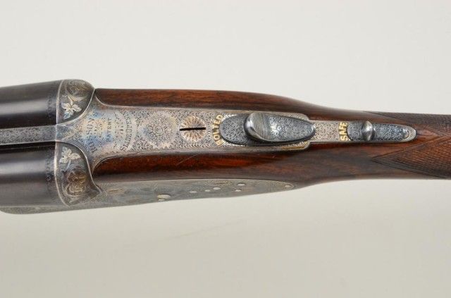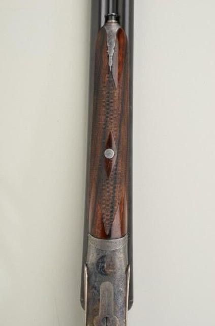 C.S. Rosson & Co. best quality side lock ejector double barrel S x S shotgun in 28 gauge with game scene engraving, serial #3359. The gun shows 27" barrels with 2-3/4" chambers (out of proof) was originally 2-1/2" and has been opened. The left barrel is choked about modified, the right barrel about cyl. The left barrel measures about .38 and the right barrel measures about .30. The gun shows double triggers; auto ejectors and English style straight stock. The stock measures 14-1/2" to the end of the butt plate with a 2-1/2" drop at the heel, 1-7/8" drop at the comb. The heel shows a ¾" cast and toe ½" cast. The barrels are dated 1931and show a Rampant Horse St., Norwich address. The barrels show 90-95% original blue finish and the frame and side plates show 75-85% case hardening with some good rainbow colors. The trigger guard shows 90%drifting and toning original blue. The stocks have been professionally refreshed and refinished. The gun shows a Rosson's patent slide opening release instead of standard lever. The gun is very nicely engraved with