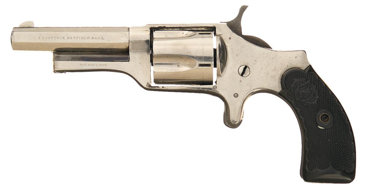 Produced circa 1880 by C.S. Shattuck of Hatfield, Massachusetts. Blade and notch sights, with the address on the left side of the frame and patent date on the left side of the barrel. Casehardened cylinder arm assembly numbered "8980", with "470" on the rear cylinder face and "8980" on the left side interior of the butt. Checkered hard rubber grips with "CS" monograms.