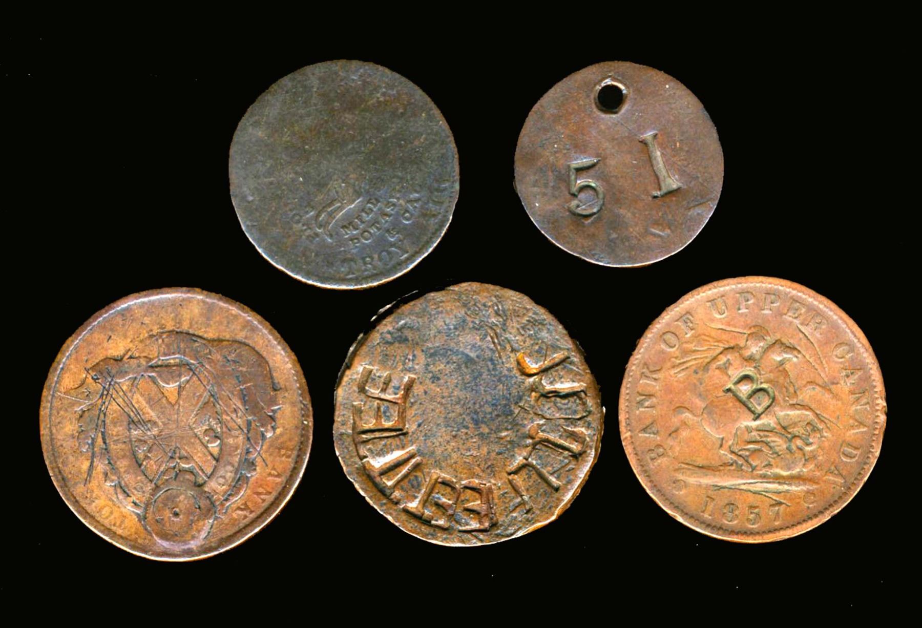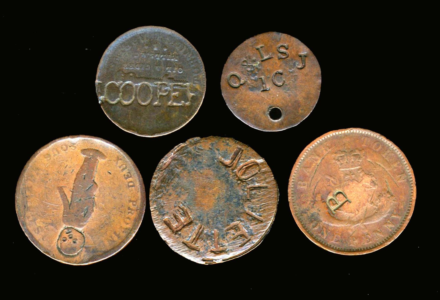 5 Pcs. Tokens w/ J.Cooper on NY-HT-368, B on PC-6b, Happy Face on LC-9b1, Q&LSJ IC on AE-26 flan 7.7 gms. & a very unique Joliette handstamped on 33 mm flan 9.8 gms. Reverse has a triple struck JOLIETTE. Extremely interesting piece. Strongly recommend the lot is viewed.