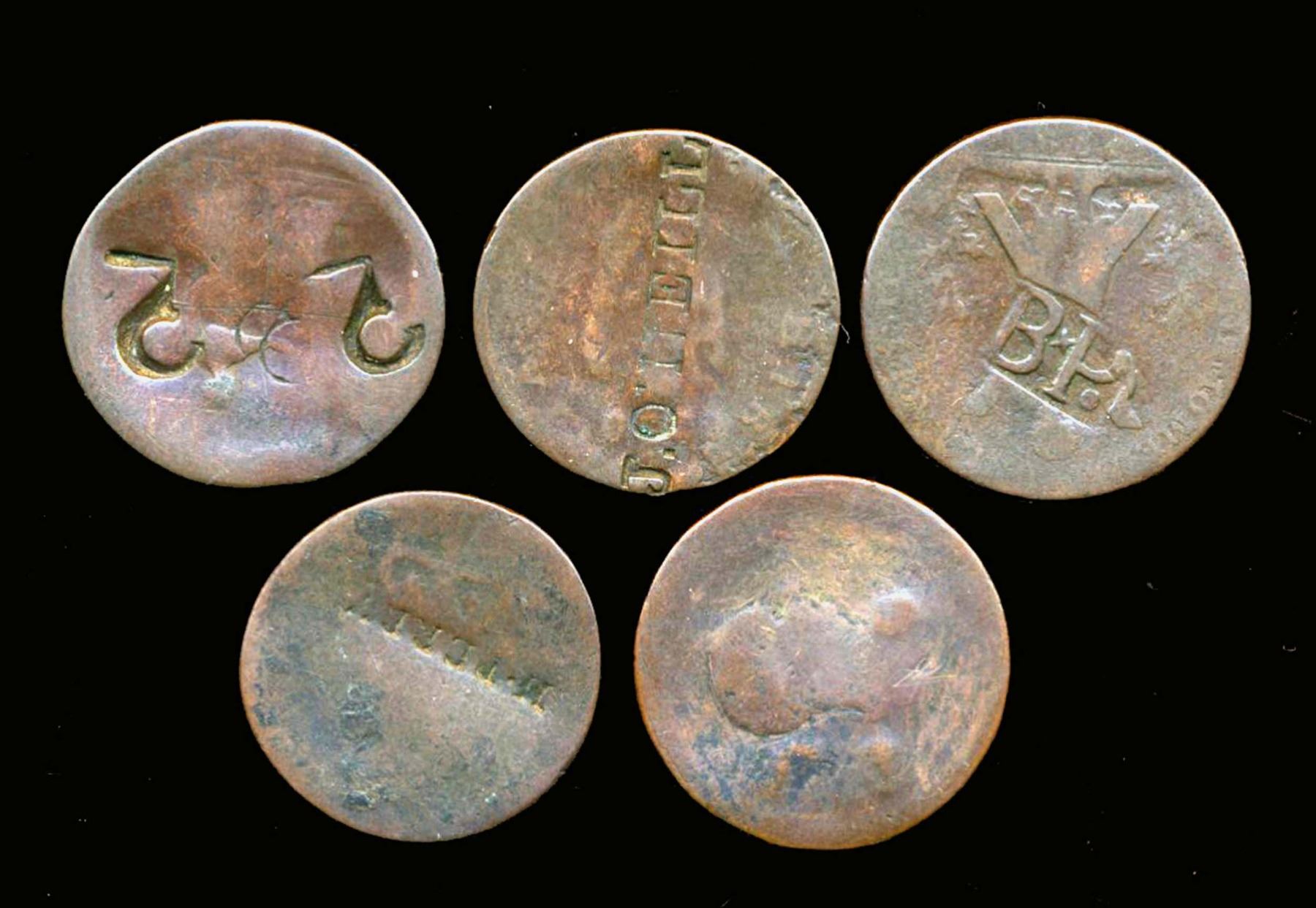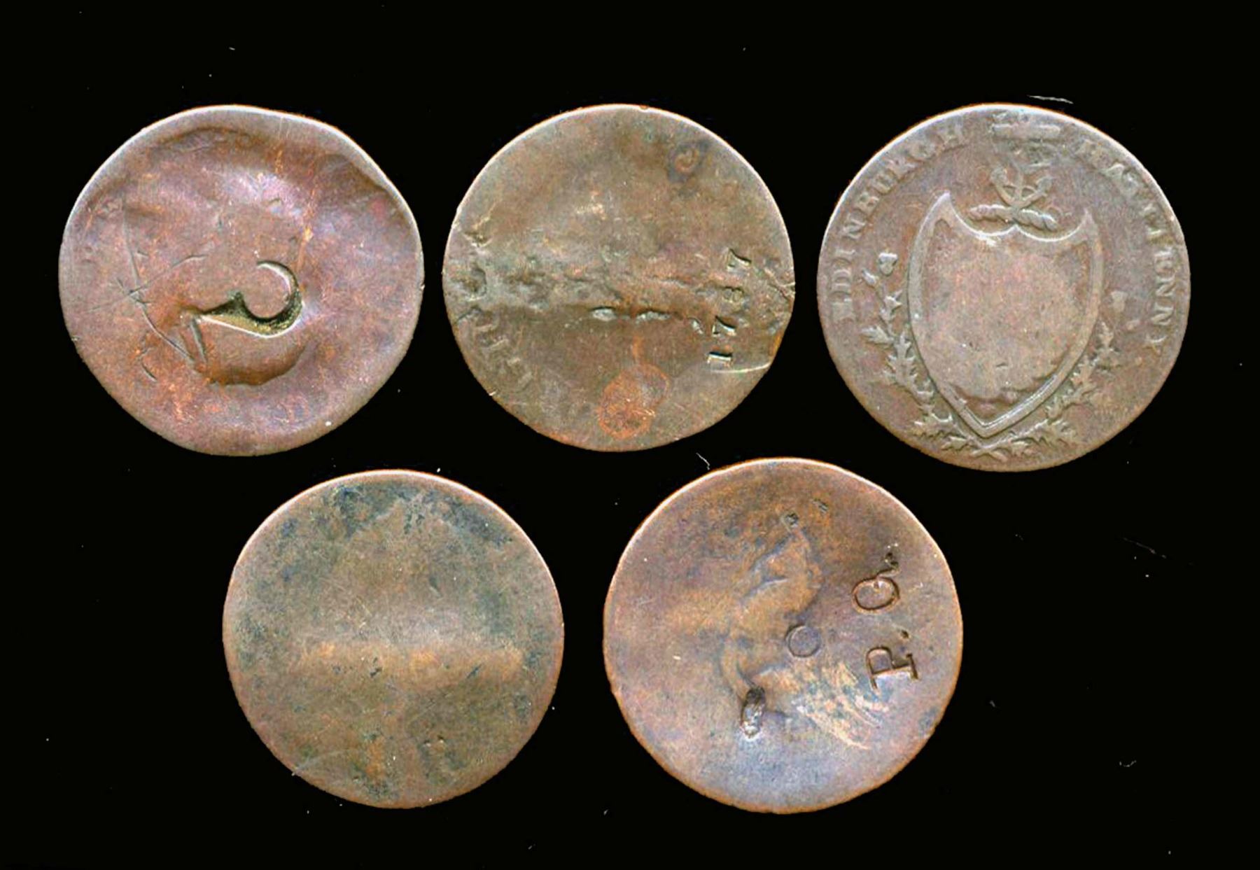 5 Pcs. All Half Penny B*P.on D&H Edinburgh Hutchison #23, 1787 J.O'Niell on Irish 1/2 cent, George II w/3 c/s, George II w/ P.Q. & H.Perry on Irish 1/2 cent. Must be viewed