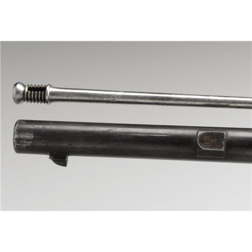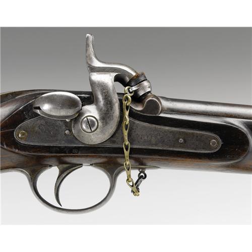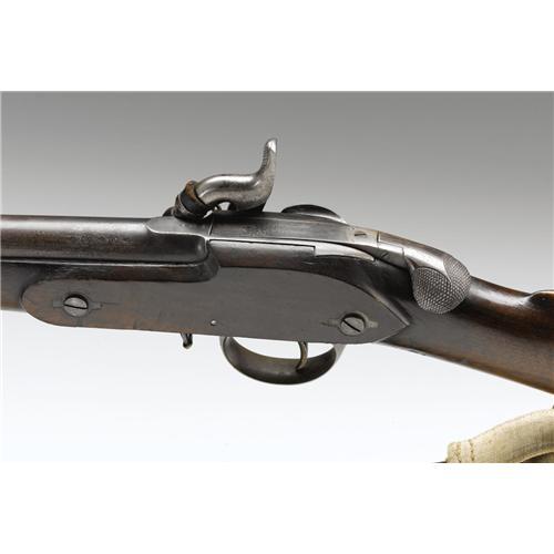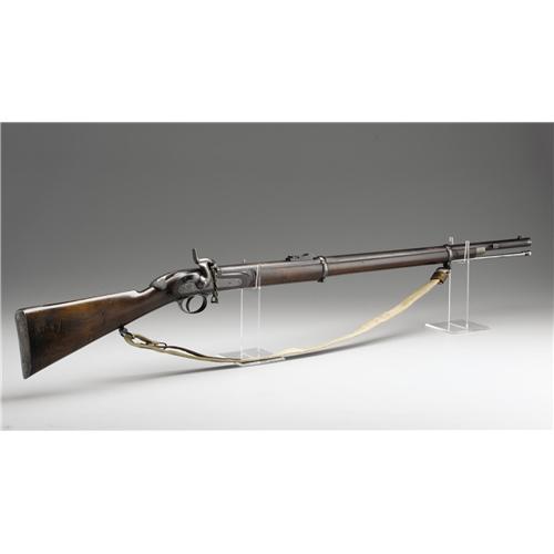 <B>Published Wilson's Breech Loading Rifle with its Original Numbered Cutlass Bayonet as Imported from Britain by the Confederate Naval Yard in Charleston, South Carolina</B></I>- ran the blockade from Britain into the Confederacy. These extremely rare firearms were modeled after the Pattern 1856/60 Short Rifle and were supplied to the Confederate Navy in very limited numbers. Our specimen is especially desirable as it shares a common marked number with its blade and is thus offered as issued. This exact pair is discussed and photographed at length in <I>Firearms From Europe</B></I> by David Noe, Larry W. Yantz and James E. Whisker (Rochester, New York: Rowe Publications, 1999). The rifle has a 54 caliber bore, is 49" overall length with 33" barrel, the lockplate stamped 1860 with crown behind hammer, breech cover plate stamped "T. WILSON/ PATENT", "A84" and "T.W." stamped on breech-loading receiver, "CSN" and "A 84" stamped on right butt of the stock, 3 proof marks on barrel, two bands, front and rear sights, nipple protector secured with brass chain. This weapon is exceptionally well preserved and retains its canvass and leather sling. All metal elements are lightly toned with good surfaces. The wood has a mellow aged patina with a few dings as expected. Overall fine condition; The cutlass-bayonet is 32.5" overall length, 26.75" blade, all steel metallic elements, rifle barrel fitting on quillon, two-piece checkered wooden grips on hilt, smooth blade lacking fuller, leather scabbard with steel tip and throat. "C.K.C." within shield stamped on ricasso, crown over "S 14" below. Inspector marks on hilt. The reverse of the tang is marked "A84", tying the cutlass to the rifle. Wear to grips, light rusting on basket interior, else very fine condition. A splendid Confederate weapon set with an impeccable provenance. A unique combination with firmly matched serial numbers on the stock and breech of the gun as well as on the bayonet, only two of these ultra rare Confederate Navy rifles are known to exist in museum collections.<BR><BR><b>Shipping:</b> Small Collectibles (<a target="_blank" href="http://www.heritageauctions.com/common/shipping.php">view shipping information</a>)