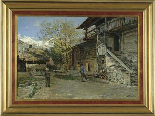 C. SCHICHTLING CARLSEN (Danish, 1852-1903) THE VISITOR. Oil on canvas colorful scene shows a man with blue coat and yellow pack basket and umbrella standing in front of a stone stairway leading to a large house or tavern. A woman is atop stairs and appears to be carrying on a conversation. The buildings continue alongside a dirt road having a man with pull cart and boy walking. Another house is at end of lane with white mountain peaks scene behind trees. Signed lower right “S. Carlsen”. The back stretchers have four labels, one by a restorer in 1953. The others indicating artist. Housed in a fine modern decorated molded wood wide frame. SIZE: 23-1/2” x 34”. CONDITION: Some inpainting, very good. 9-26779