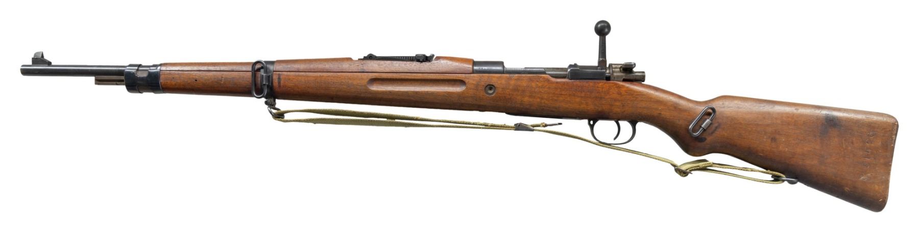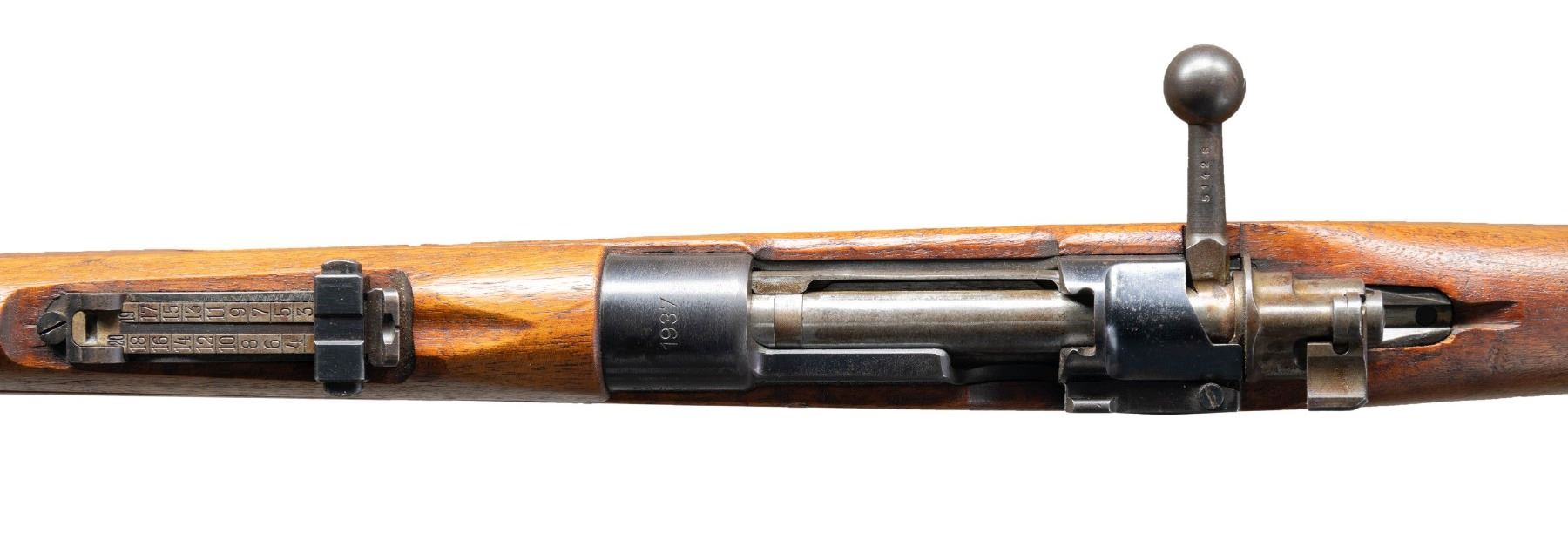 Cal. 8x57 (8mm Mauser). S# 51426. Bbl. 23 1/4". Standard VZ-24 sights. Matching numbers on receiver, bolt & stock with stock properly having a "C" prefix. The C-prefix VZ-24 rifles were reportedly sent to both China & Japan. The condition & lack of import markings on this rifle highly suggest Japanese usage but no Kanji markings present . Receiver top has 1937 date. Blued finish. Walnut stock with left side & bottom mounted sling swivels. Canvas USGI style sling present. No cleaning rod present. CONDITION: stock shows a very small chip at front of handguard, some worn finish, scattered dings & handling marks. Metal retains 70% original blue with some light dings on front band, scattered light oxidation & fading. Action functions properly when hand cycled. Bright near excellent bore. (25-2741/MJC). CURIO. $500-700.