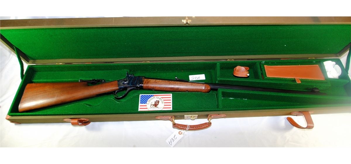 C. SHARPS .45 CAL "OLD RELIABLE" BLACK POWDER REPLICA RIFLE WITH ORIGINAL CASE 30" OCTAGON BARREL WITH BRIGHT EXCELLENT BORE . THE BARREL RETAINS ABOUT 99% PLUS ORIGINAL MATTE BLUE FINISH WHILE THE FRAME, HAMMER AND LEVER