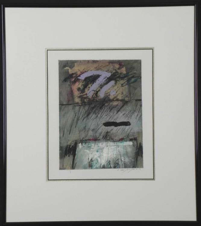 Here is a mostly pastel hued monoprint, with layers of black and white paint, along with some shiny gold. The abstract lines are well defined and full of details. Artist: C. Scott Snyder Signature: Signed "C. Scott Snyder" in pencil, lower right Medium: Monoprint on paper Title: Untitled Edition: 1/1 Year: 1989 Image size: 7 1/2 x 10 inches Framing: Double matted in gold and white, in black metal frame Frame size: 20 1/4 x 18 inches Condition: Excellent Appraisal: Done by Billy Hork Galleries in 1989, valued at $470