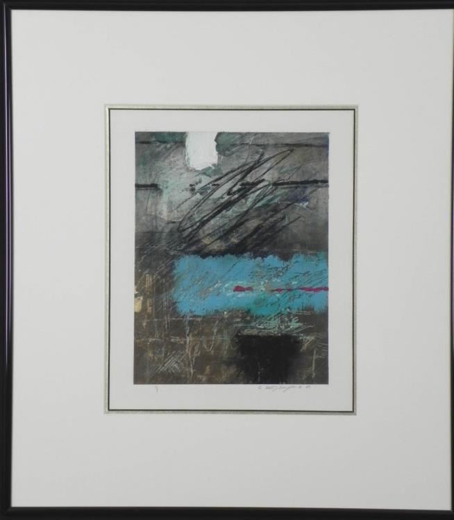 Here is a monoprint with layers of gold paint and detailed black lines. Light blue with a red stripe dominates the foreground in this nice abstract. Artist: C. Scott Snyder Signature: Signed "C. Scott Snyder" in pencil, lower right Medium: Monoprint on paper Title: Untitled Edition: 1/1 Year: 1989 Image size: 7 1/2 x 10 inches Framing: Double matted in gold and white, in black metal frame Frame size: 20 1/4 x 18 inches Condition: Excellent Appraisal: Done by Billy Hork Galleries in 1989, valued at $470