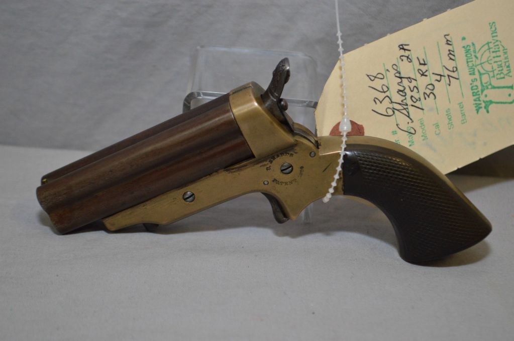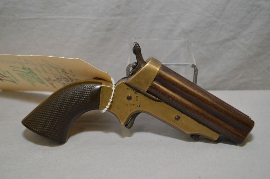 C. Sharp's & Co. Model 1859 2A .30 Rimfire Cal 4 Shot Pepperbox Pistol w/3" or 76 mm bbls [ barrels turned brown, brass frame with nice old patina marked C. Sharps & Co. Philida, P.A. on right side, left side C. Sharp's Patents 1859, the 2A has a straight standing breech, and a straight grip to frame structure, spur trigger, checkered gutta percha grips, Approx. 26,5000 Manfg Circa 1859 - 1874 ] Ser 6368 ANTIQUE No pal required