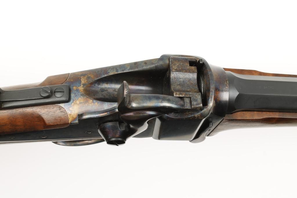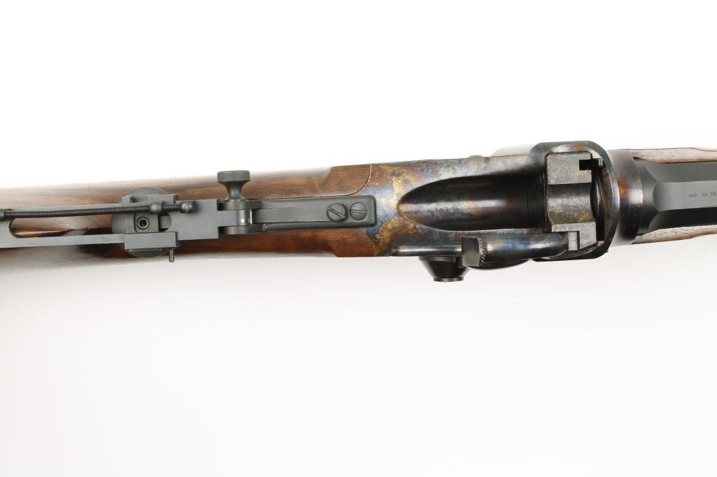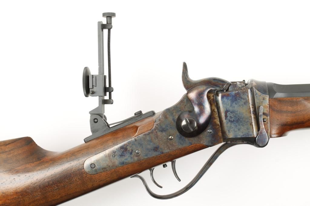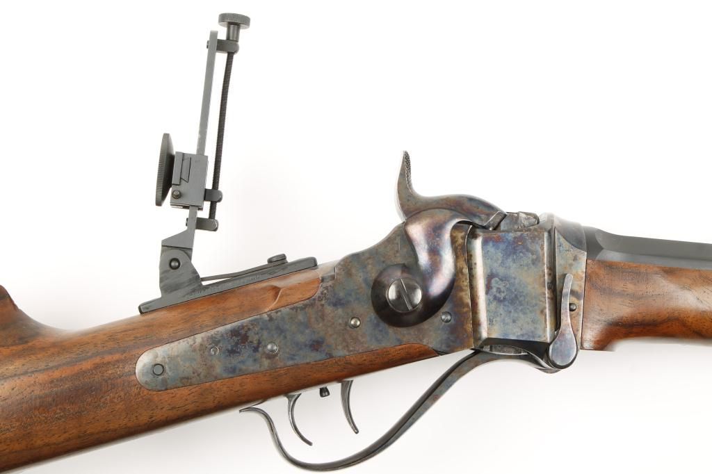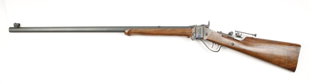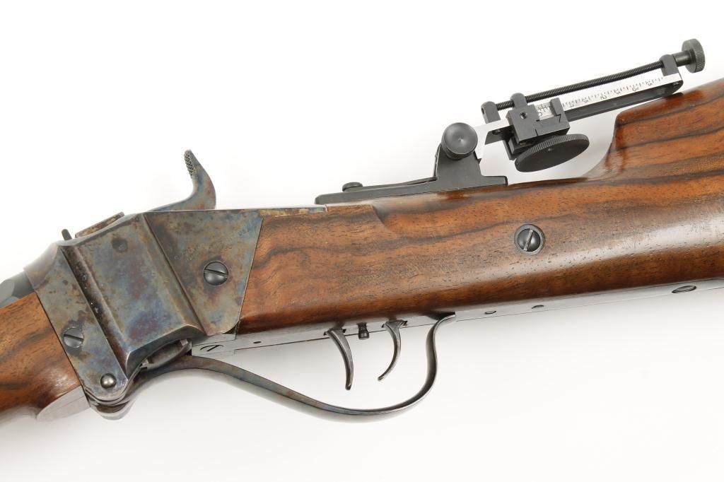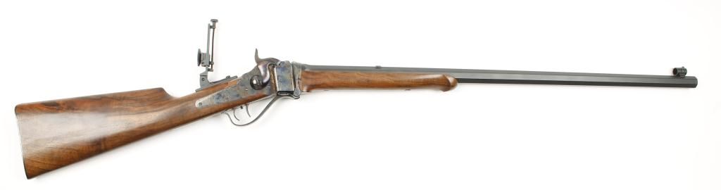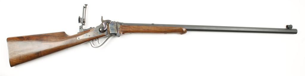 C. Sharps Big Timber, Montana Model 1874 sporting rifle in .45-70 caliber showing factory upgraded wood. The rear tang sight is adjustable for windage and elevation could target type front sight double set triggersstandard weight barrel the rifle remains in find to excellent condition 95 to 98% of its original finish starting to tone slightly and fine would showing a pronounced grain. The action is tight the bore is excellent. Thisrifle was made on custom order for noted competition shooter in collector John Goodlad consign from his estate est: $2,500-$5,000