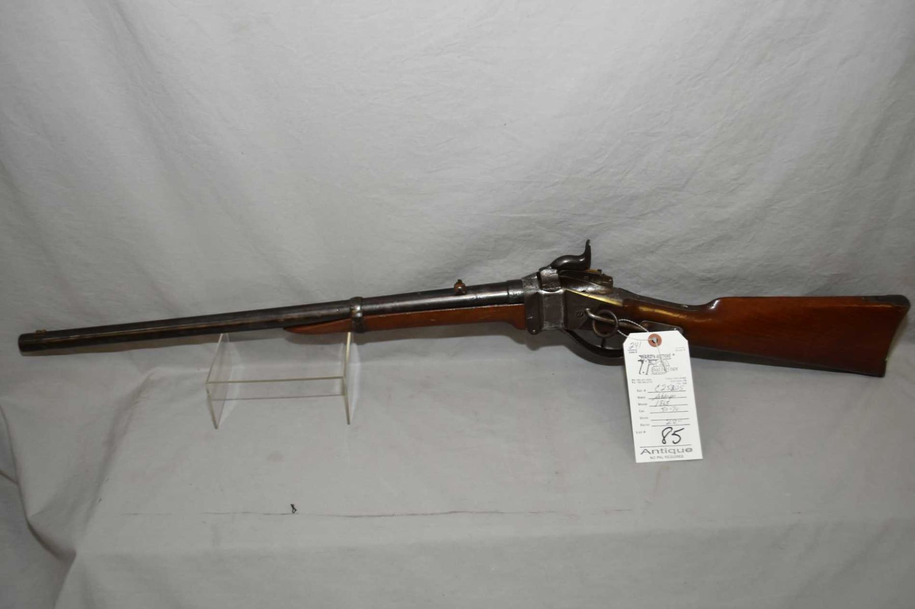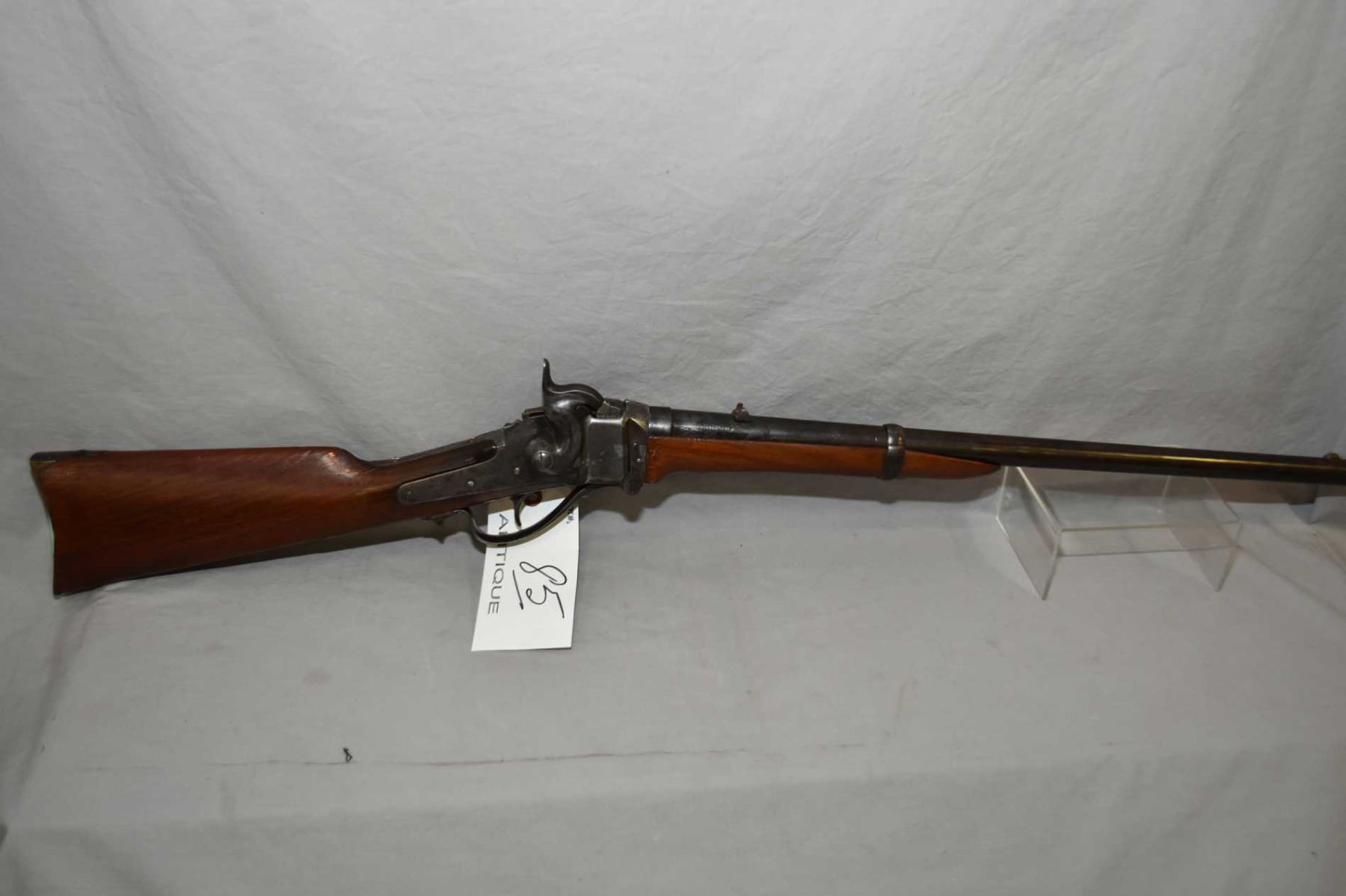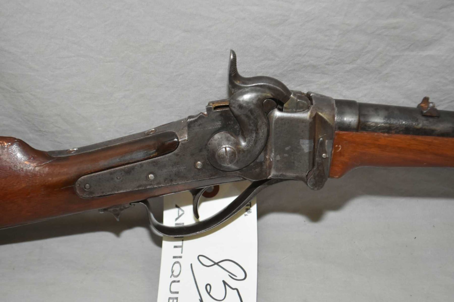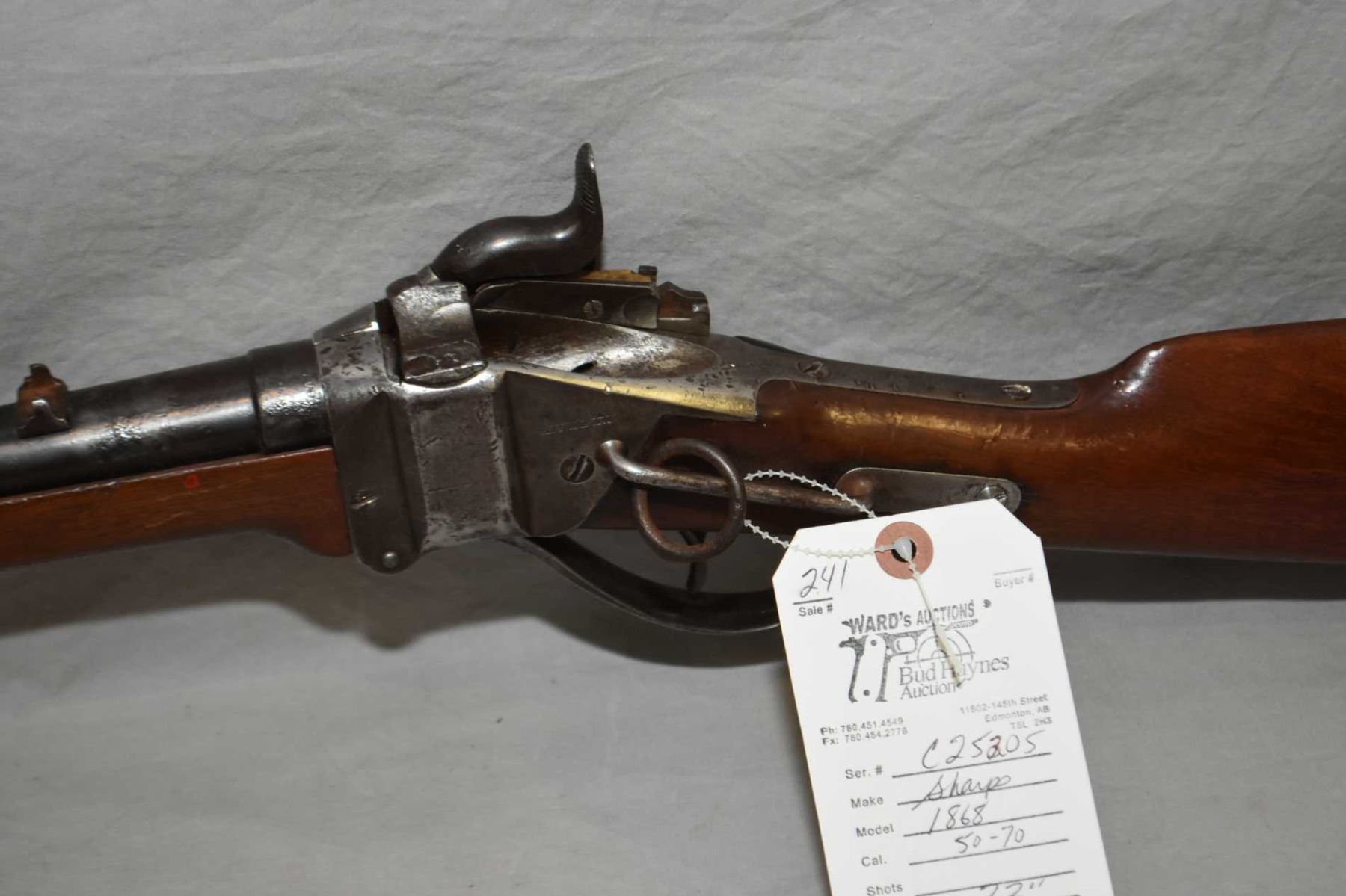 C. Sharps Model 1868 Cartridge Carbine .50/ 70 Cal Single Shot Saddle Ring Carbine w/ 22" bbl [ receiver marked R.S. Lawrence Pat April 12, 1859, also C.Sharps Pat. Oct.5, 1852, left side marked C.Sharps Pat. Sept. 12, 1846, rear sight missing but saddle remains, patchy blued finish turning brown, good forewood, butt stock has no patch box , but metal butt plate is machined to accomodate ] Ser # C25205 ANTIQUE NO PAL REQ