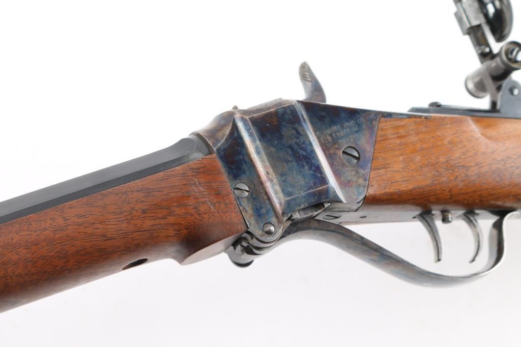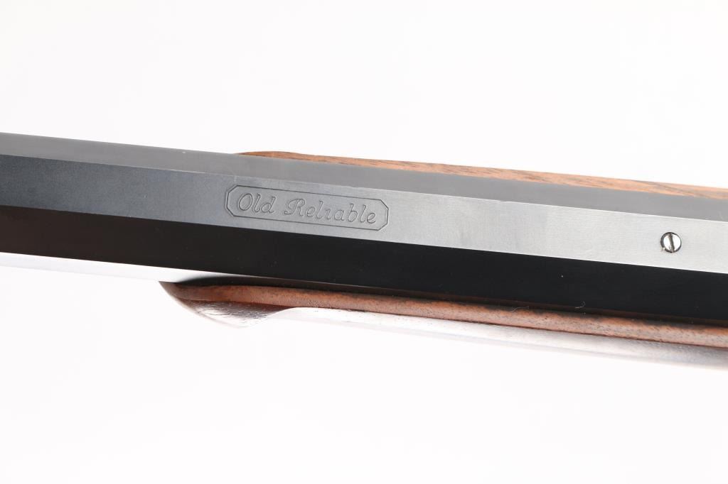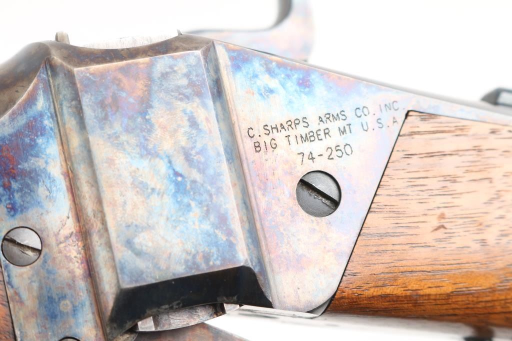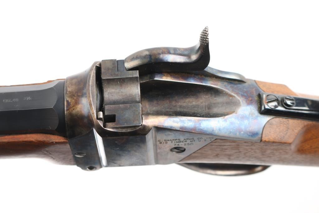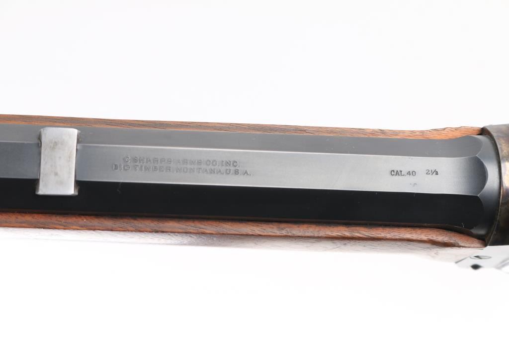 'Old Reliable' Straight breech falling block single shot "Buffalo Rifle" chambered in .40 Cal., marked "CAL.40 2 1/2", manufactured in Big Timber, MT. Features 30" heavy octagonal barrel with a globe front sight with bubble level, adjustable vernier tang peep sight with variable peep apertures, no rear sight on barrel. Blued barrel. Case-hardened receiver, triggerguard/lever, and Sharps factory buttplate. Smooth Schnabel forend, smooth semi-pistol grip butt stock, double-set triggers. Bore is excellent/bright. Falling-block action is smooth. Hammer locks-up tight. Wood is near excellent with little to no marks or scratches. Metal finish is about 98% with some very minor edge wear/scratches. Case colors are fiery & bright with a dense tight color pattern.