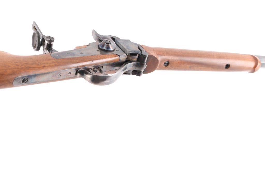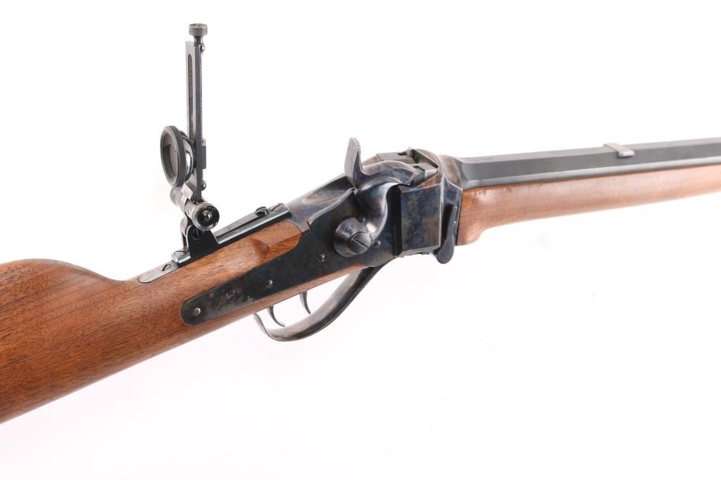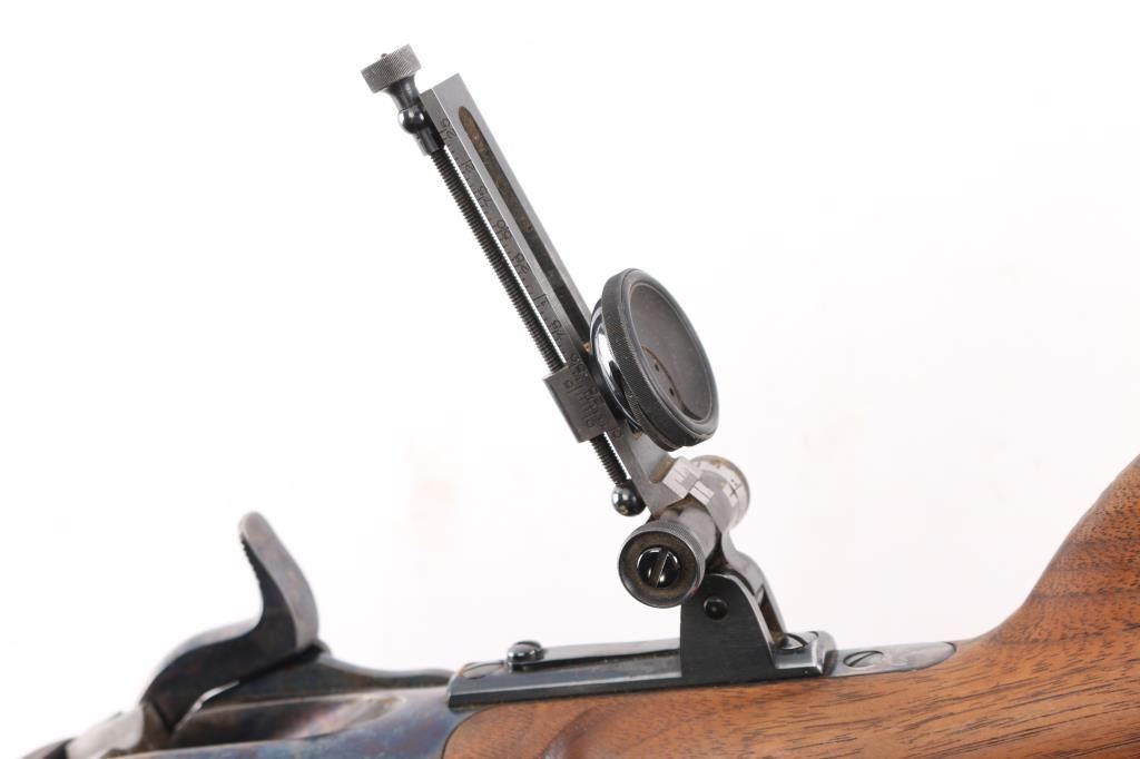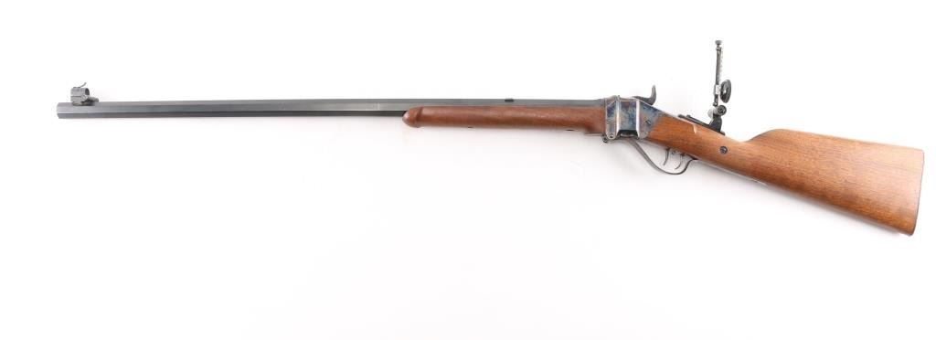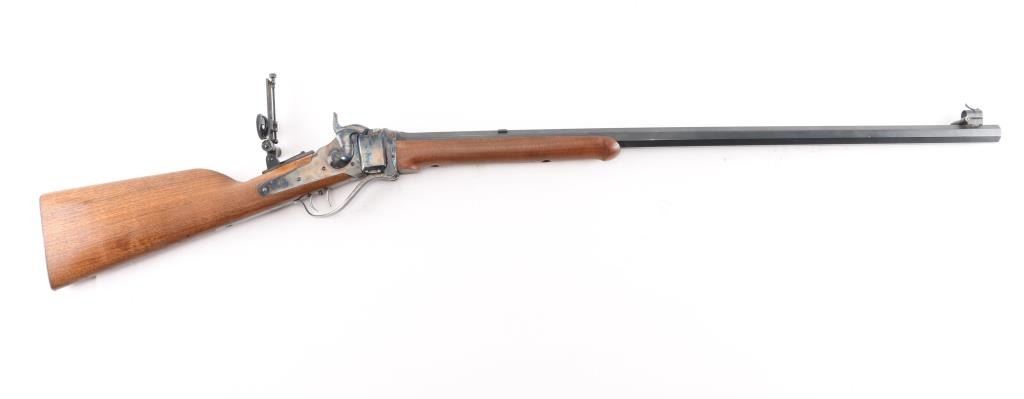 'Old Reliable' Straight breech falling block single shot "Buffalo Rifle" chambered in .40 Cal., marked "CAL.40 2 1/2", manufactured in Big Timber, MT. Features 30" heavy octagonal barrel with a globe front sight with bubble level, adjustable vernier tang peep sight with variable peep apertures, no rear sight on barrel. Blued barrel. Case-hardened receiver, triggerguard/lever, and Sharps factory buttplate. Smooth Schnabel forend, smooth semi-pistol grip butt stock, double-set triggers. Bore is excellent/bright. Falling-block action is smooth. Hammer locks-up tight. Wood is near excellent with little to no marks or scratches. Metal finish is about 98% with some very minor edge wear/scratches. Case colors are fiery & bright with a dense tight color pattern.