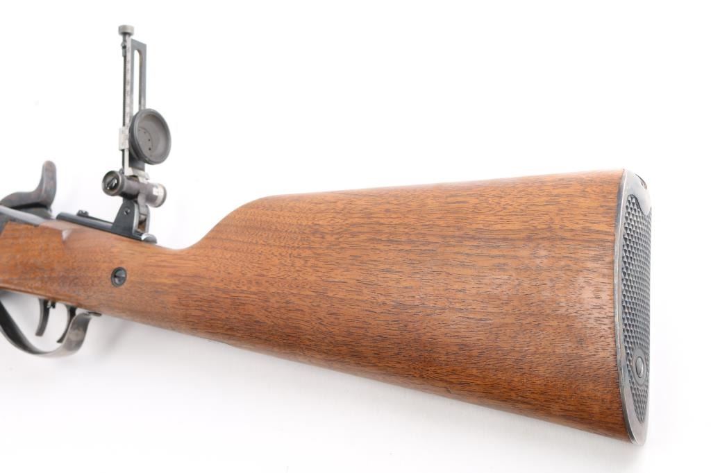 GOOD: Some minor replacement parts; metal smoothly rusted or lightly pitted in places, cleaned or re-blued; principal letters, numerals and design on metal legible; wood refinished, scratched bruised or minor cracks repaired; in good working order.