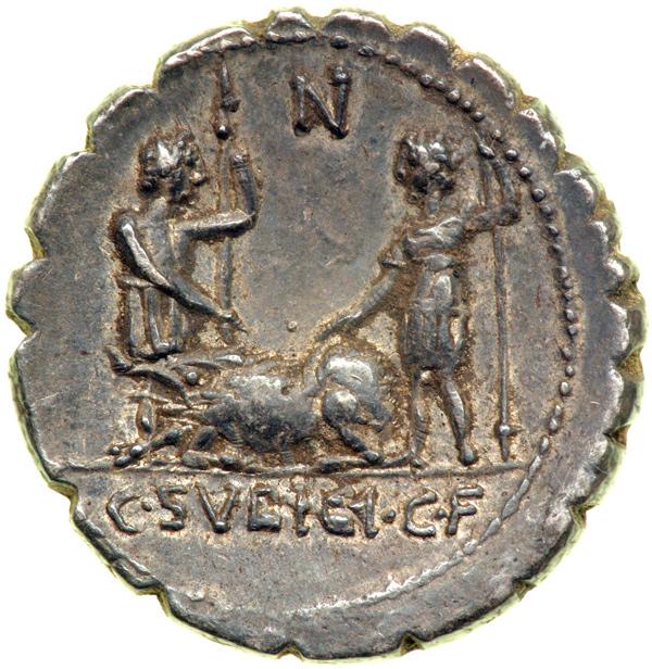 C. Sulpicius C.f. Galba, moneyer. AR Serrated Denarius minted at Rome, c. 106 BC. Conjoined laureate heads left of the Dei Penates. Reverse: Two soldiers swearing allegiance over sow. Sulpicia 1; Cr. 312/1; Syd. 572. Superb Extremely Fine. .