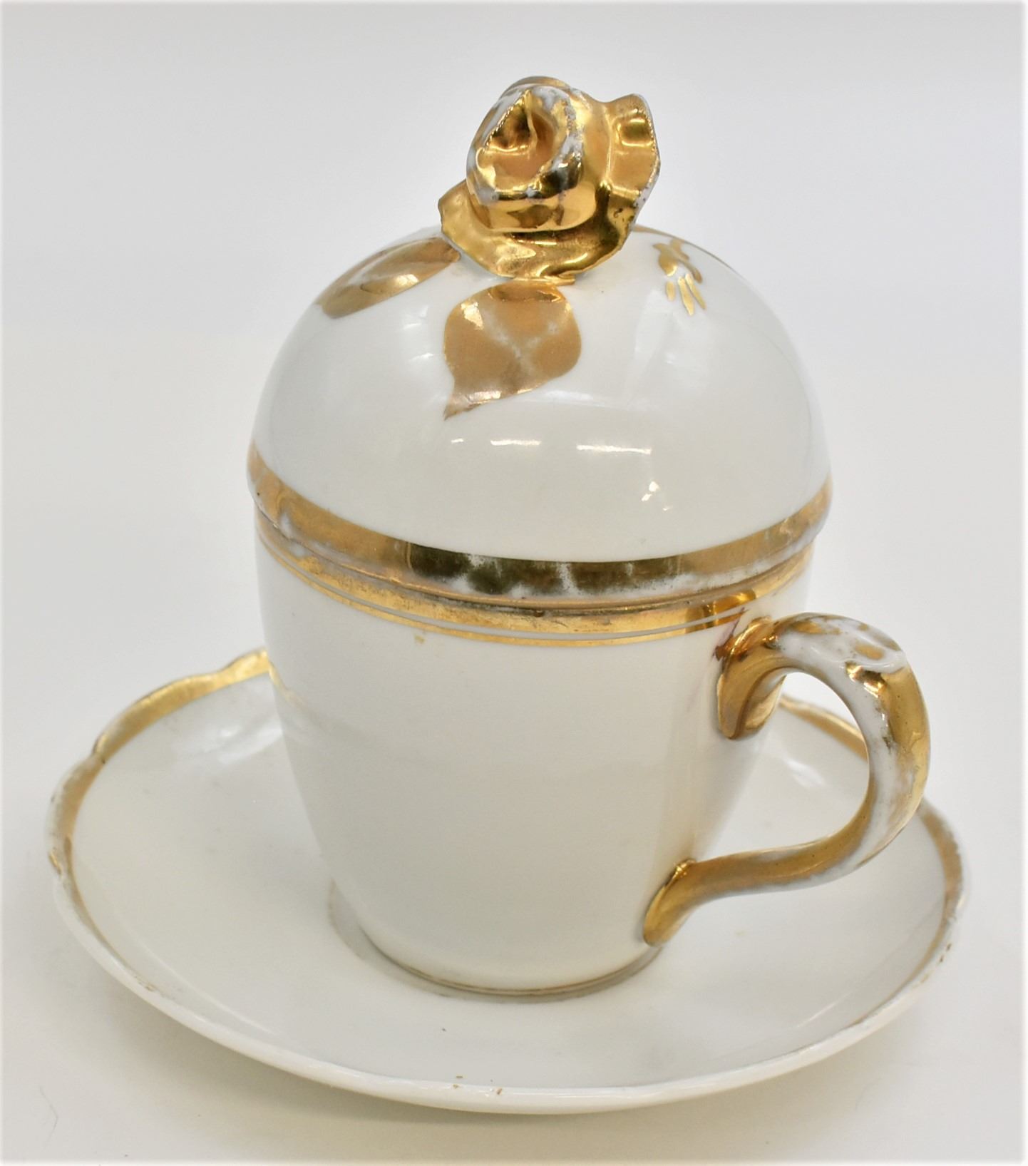 Carl Tielsch Altwasser Silesia Covered Custard Cup With Under Plate (c.1925) measures 5'' x 6'', features gold gilt rose on lid and rim of under plate, FYI: ''Carl Tielsch founded the Altwasser factory in 1845. It swiftly became second largest porcelain factory in Silesia. After twenty years the factory employeed 1,400 employees. Products of the Tielsch factory quickly became known for its high quality and artistic values. Their quality was compared to porcelain manufactures from Berlin or even Meissen.''