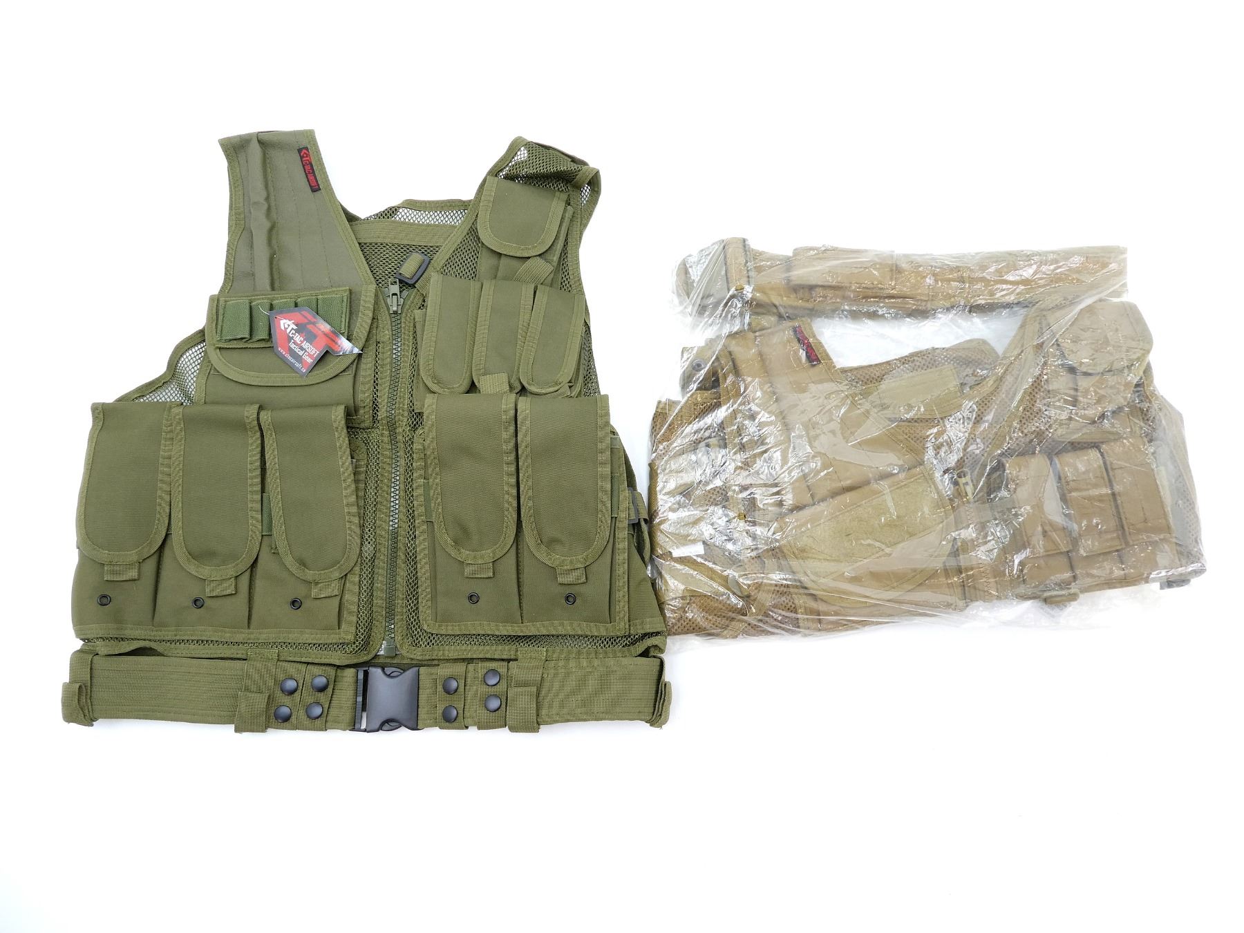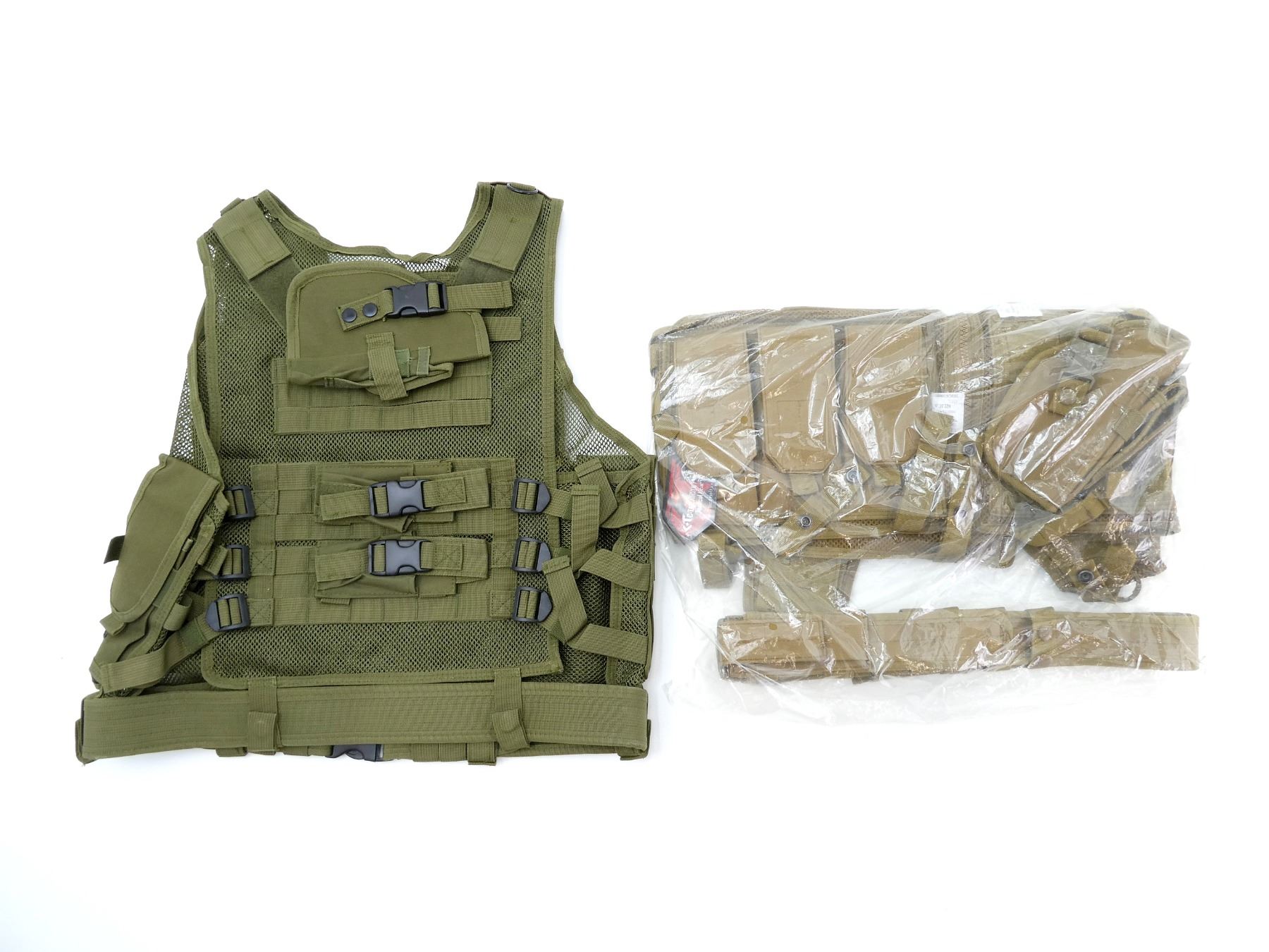 LOT INCLUDES; (1) COYOTE BROWN, POLYESTER CONSTRUCTION, ADJUSTABLE WITH SIX LARGE RIFLE MAGAZINE POUCHES, TWO SMALL UTILITY POUCHES & TWO MAP POUCHES ON THE INSIDE, WITH ZIP CLOSURES, ADJUSTABLE, NOS, WITH ORIGINAL TAGS, (1) GREEN, POLYESTER CONSTRUCTION, ADJUSTABLE WITH SIX LARGE RIFLE MAGAZINE POUCHES, TWO SMALL UTILITY POUCHES & TWO MAP POUCHES ON THE INSIDE, WITH ZIP CLOSURES, ONE-SIZE - PULL-TAB/CLIP ADJUSTABLE SIDES, NOS, WITH ORIGINAL TAGS. SEE PHOTOS.
