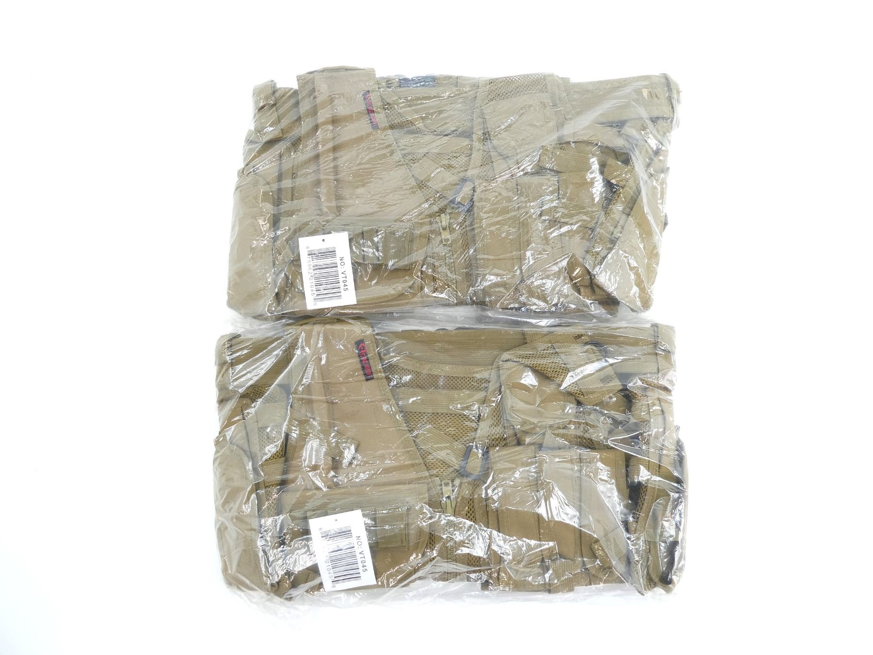 LOT INCLUDES; (2) COYOTE BROWN, POLYESTER CONSTRUCTION, ADJUSTABLE WITH SIX LARGE RIFLE MAGAZINE POUCHES, TWO SMALL UTILITY POUCHES & TWO MAP POUCHES ON THE INSIDE, WITH ZIP CLOSURES, ADJUSTABLE, NEW OLD STOCK, WITH ORIGINAL TAGS. SEE PHOTOS.