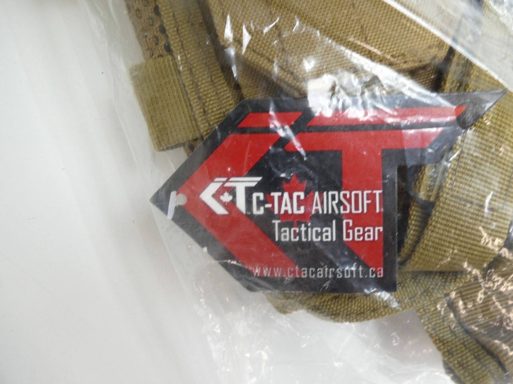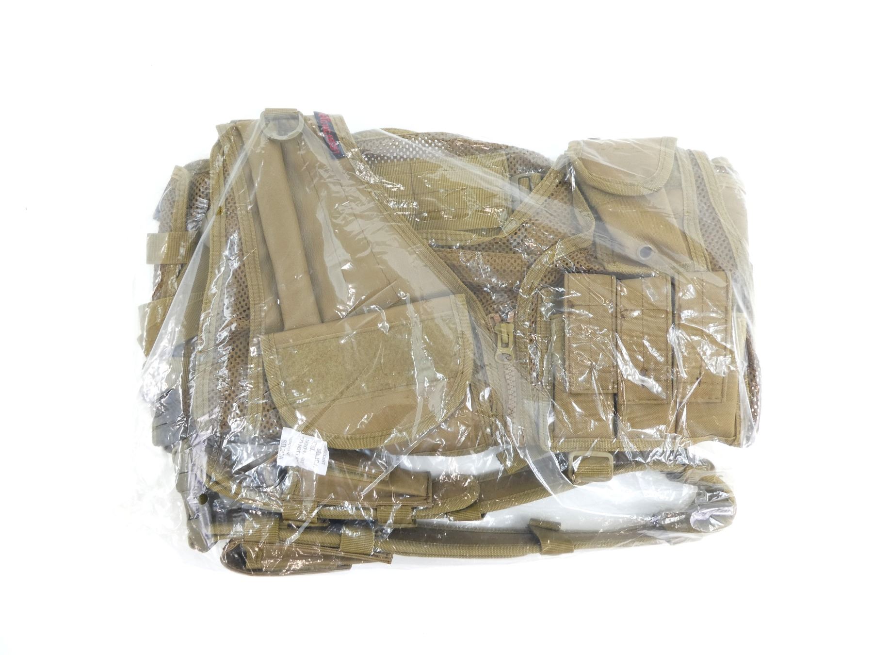 (1) COYOTE BROWN, POLYESTER CONSTRUCTION, ADJUSTABLE WITH SIX LARGE RIFLE MAGAZINE POUCHES, TWO SMALL UTILITY POUCHES & TWO MAP POUCHES ON THE INSIDE, WITH ZIP CLOSURES, ADJUSTABLE, NOS, WITH ORIGINAL TAGS. SEE PHOTOS.