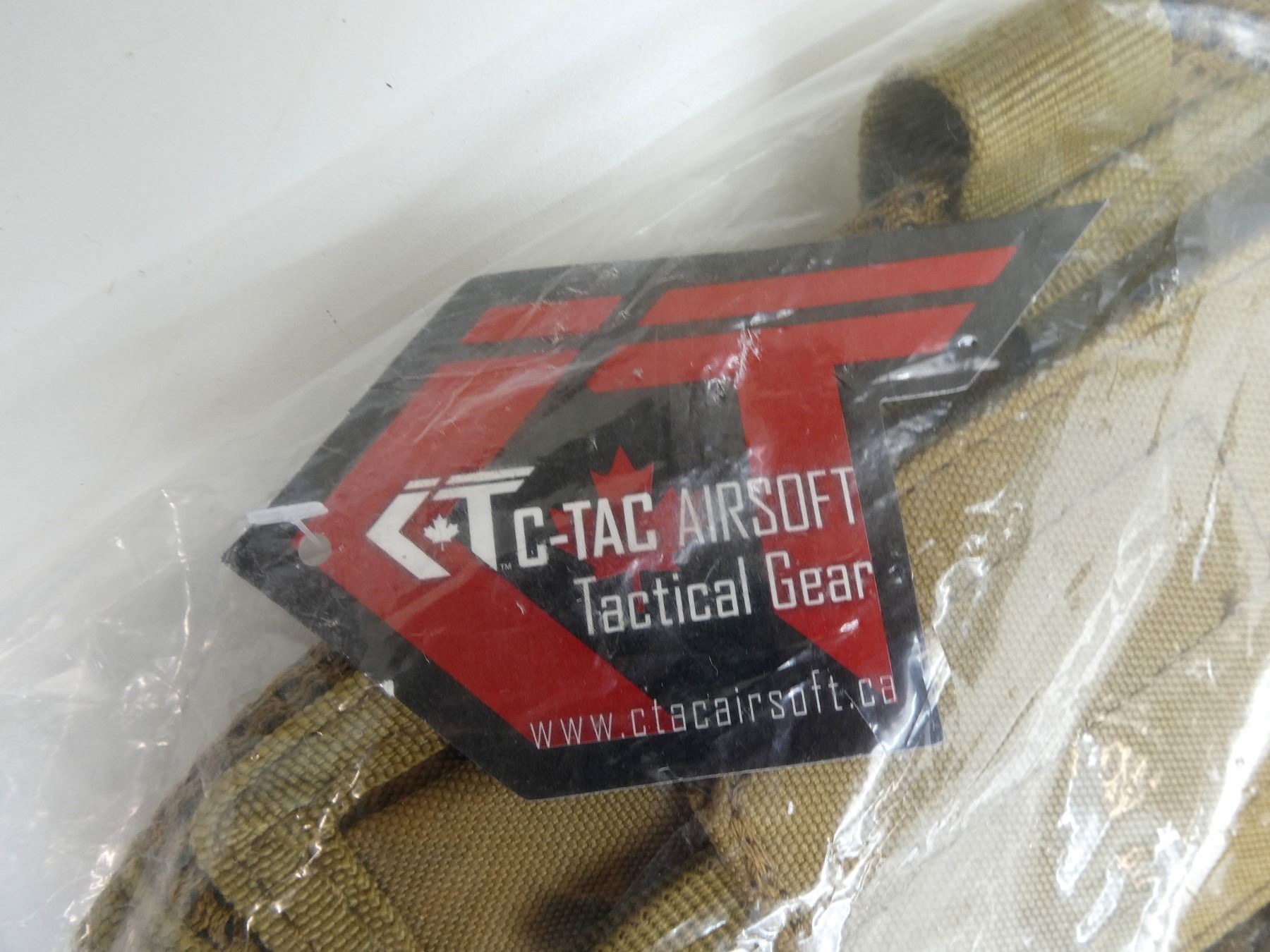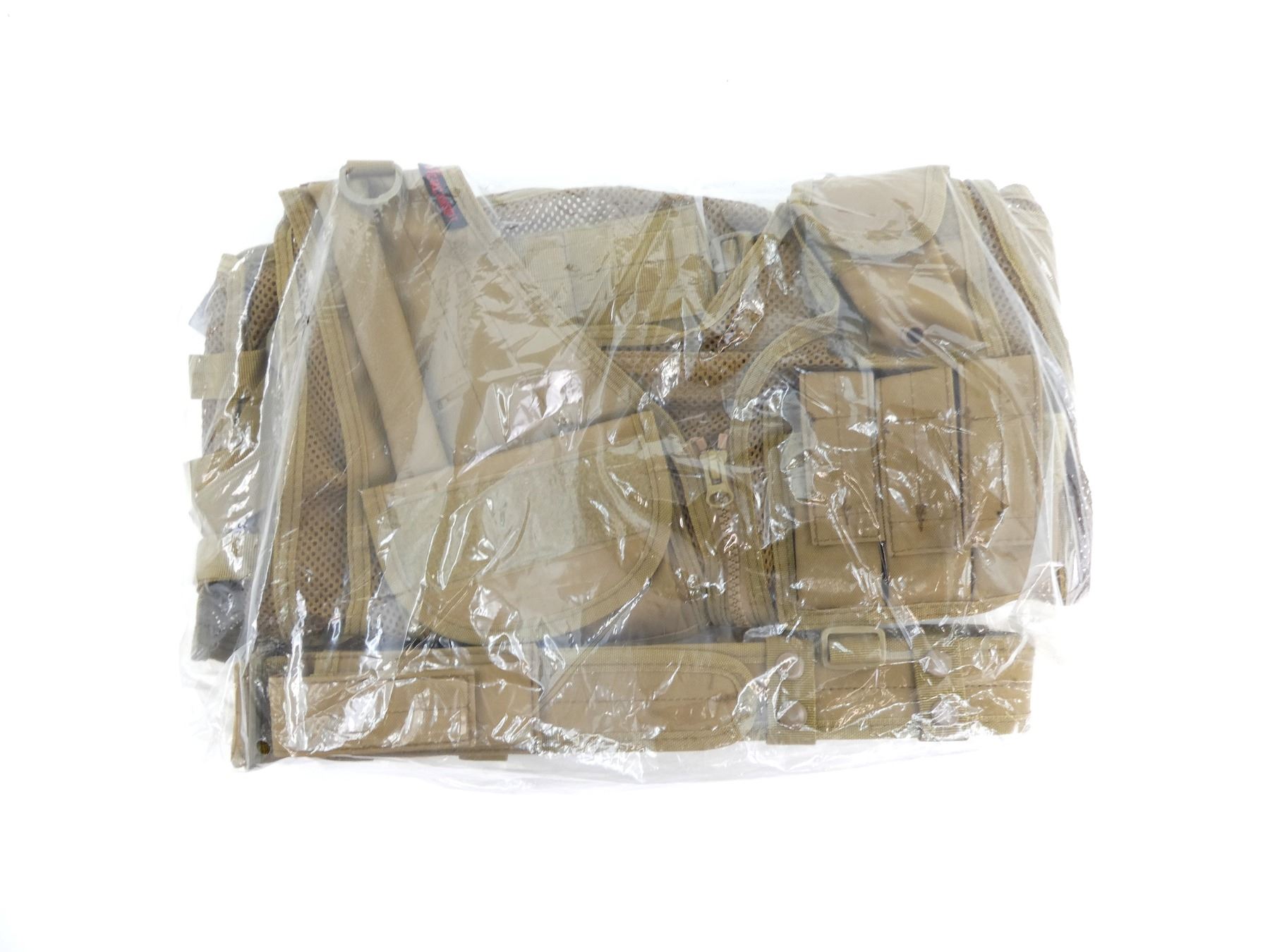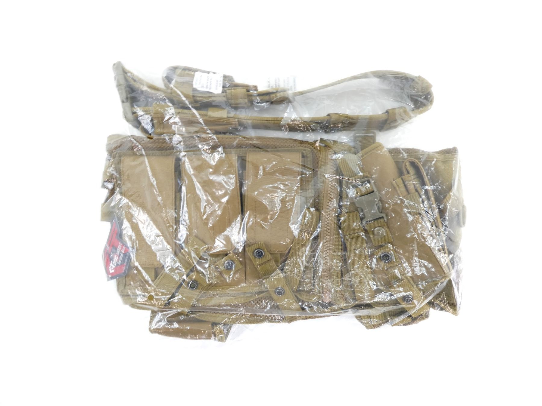 (1) COYOTE BROWN, POLYESTER CONSTRUCTION, ADJUSTABLE WITH SIX LARGE RIFLE MAGAZINE POUCHES, TWO SMALL UTILITY POUCHES & TWO MAP POUCHES ON THE INSIDE, WITH ZIP CLOSURES, ADJUSTABLE, NOS, WITH ORIGINAL TAGS. SEE PHOTOS.