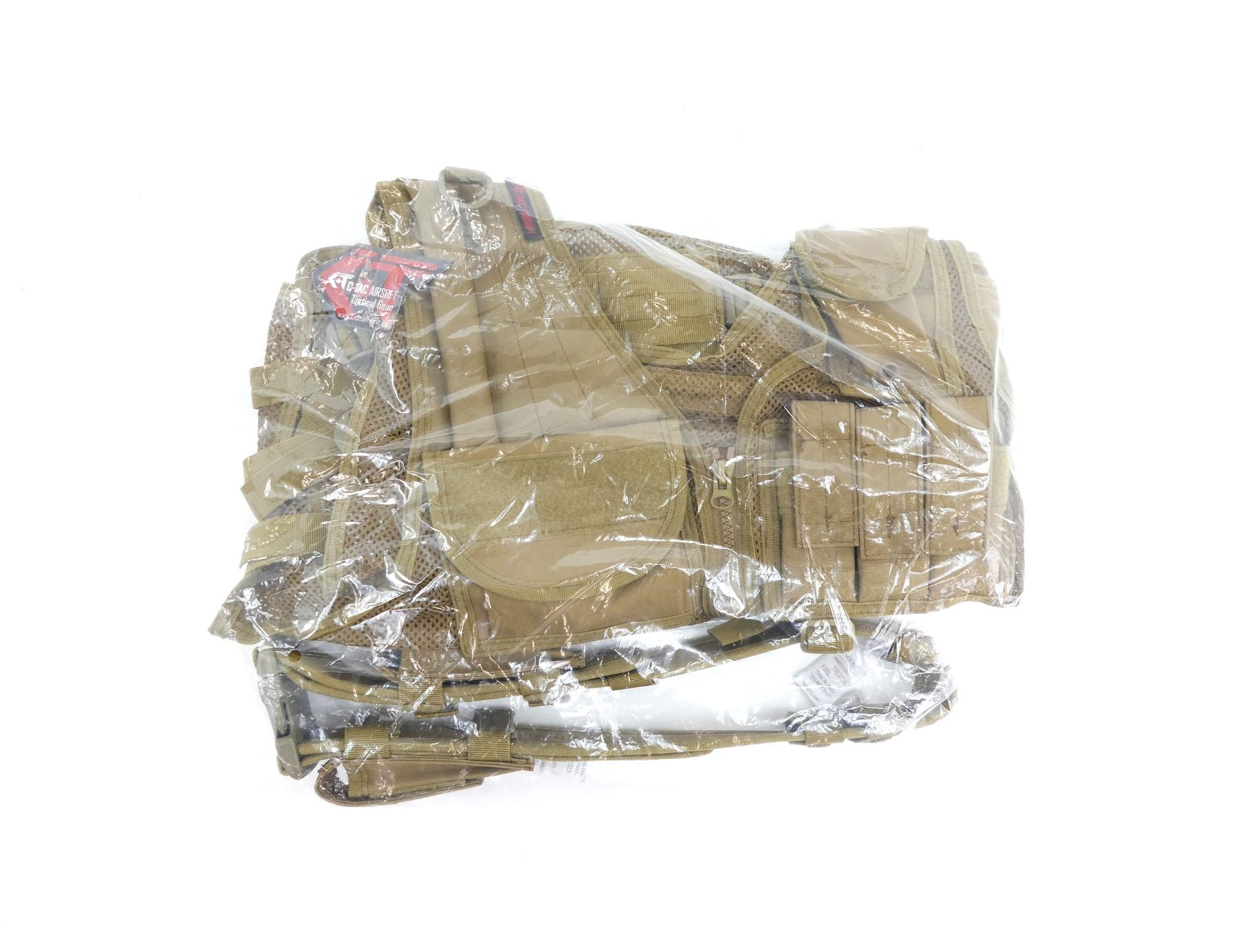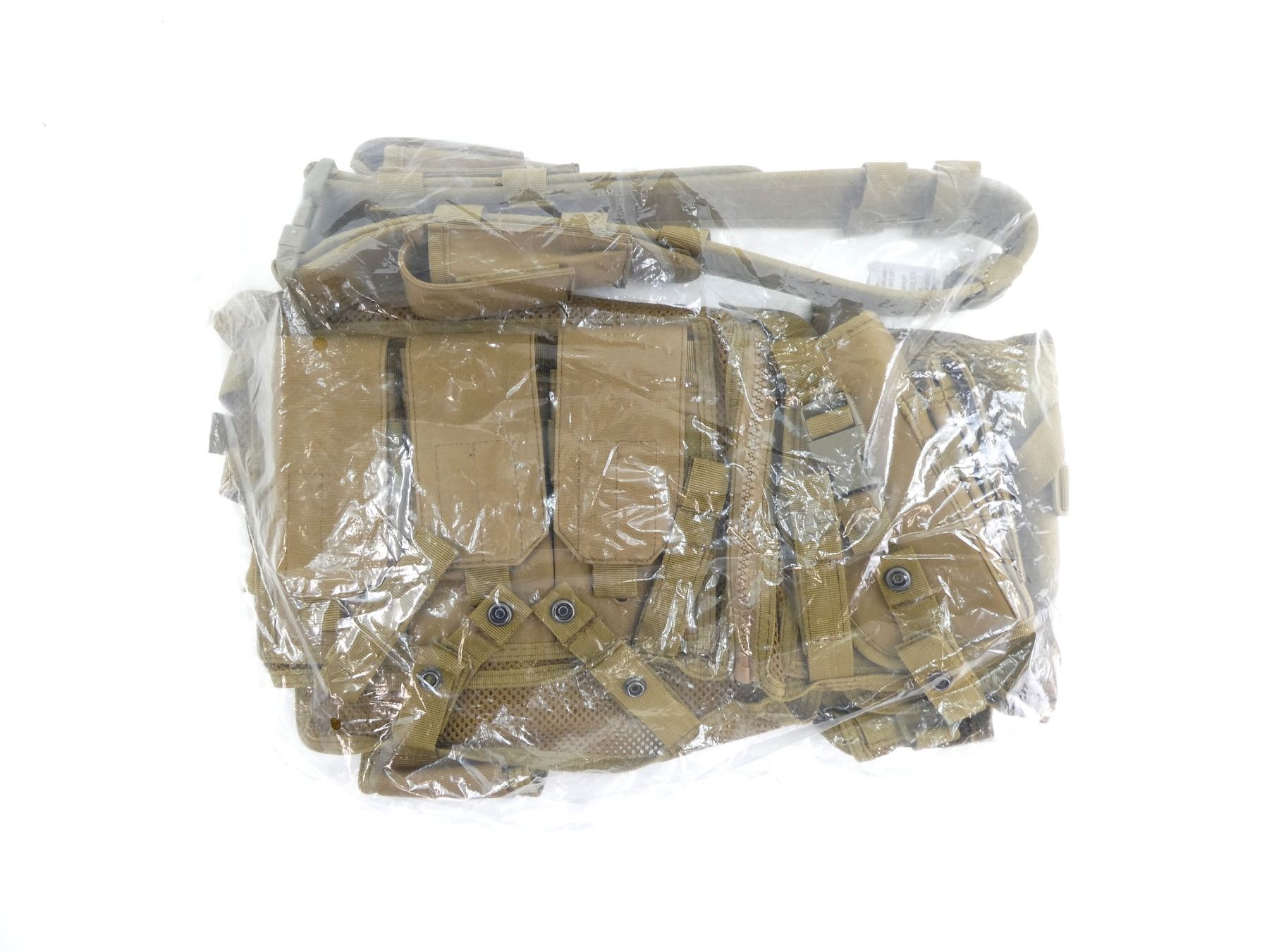 (1) COYOTE BROWN, POLYESTER CONSTRUCTION, ADJUSTABLE WITH SIX LARGE RIFLE MAGAZINE POUCHES, TWO SMALL UTILITY POUCHES & TWO MAP POUCHES ON THE INSIDE, WITH ZIP CLOSURES, ADJUSTABLE, NOS, WITH ORIGINAL TAGS. SEE PHOTOS.
