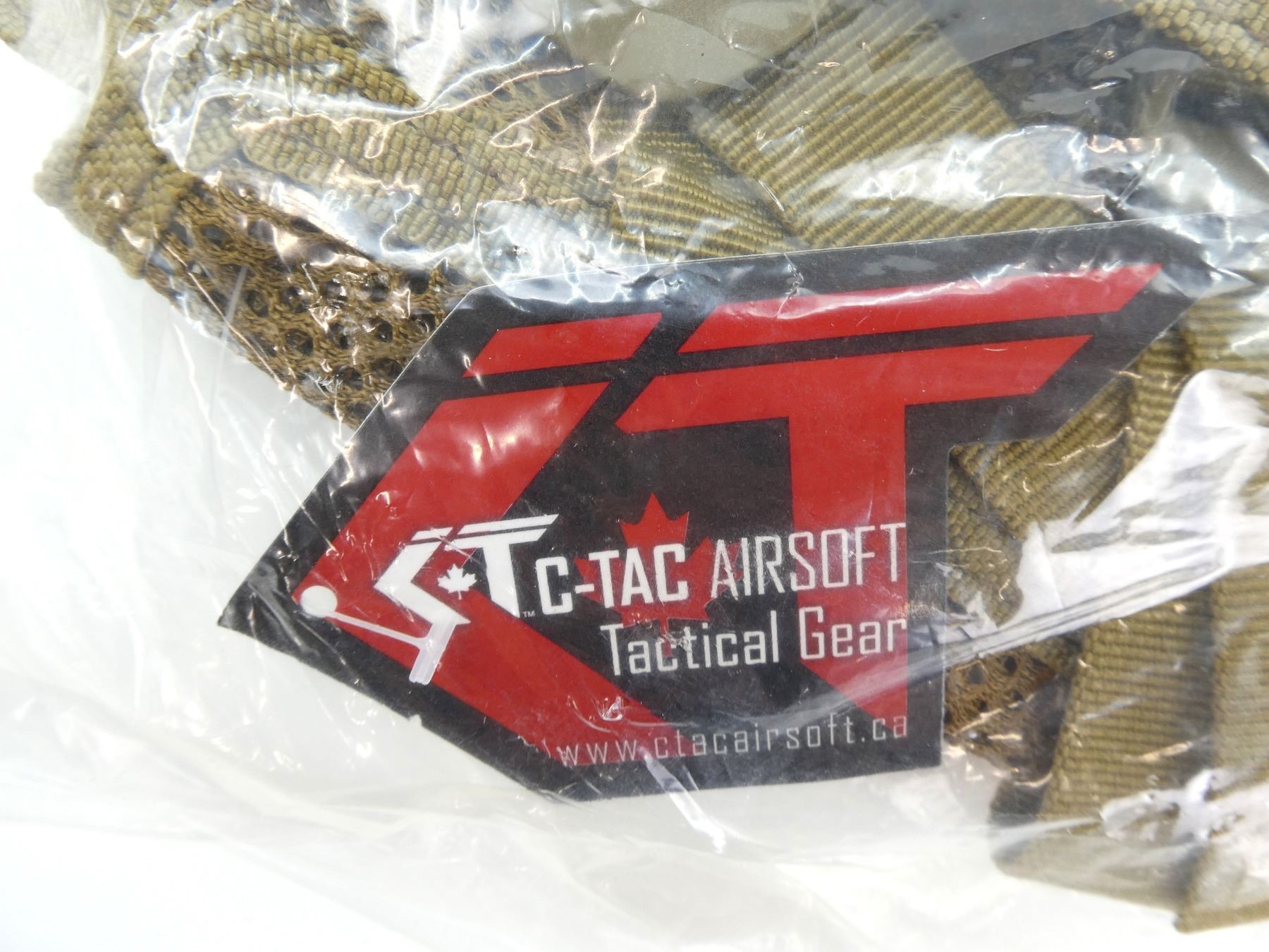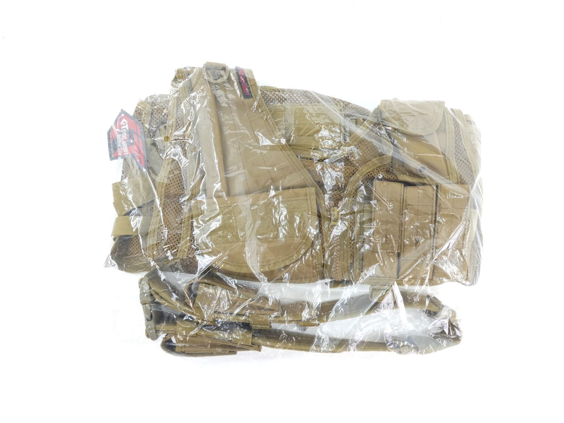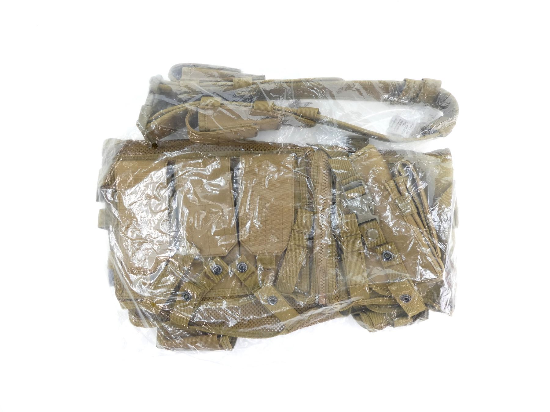 (1) COYOTE BROWN, POLYESTER CONSTRUCTION, ADJUSTABLE WITH SIX LARGE RIFLE MAGAZINE POUCHES, TWO SMALL UTILITY POUCHES & TWO MAP POUCHES ON THE INSIDE, WITH ZIP CLOSURES, ADJUSTABLE, NOS, WITH ORIGINAL TAGS. SEE PHOTOS.
