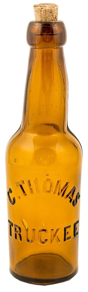 C. Thomas, Truckee, Cal. Extremely rare half pint. Amber tooled top beer bottle with original cork. This bottle was found in the wall of a house in Truckee about 1979. It dates to about 1900. As far as we know it is one of two or three known specimens. It's certainly must be the finest known example or perhaps tied. See Holabird, Vol.I, pp137-140. Holabird collection. City: Truckee State: California Inventory Number: 26464