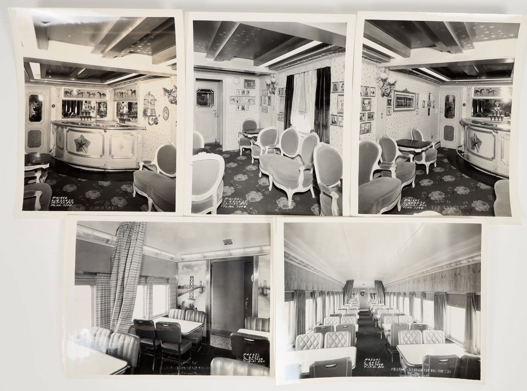 Group of Railroad Interior photographs, black & white, 5. Includes photos of a then-new Central & Union Pacific car, designed to look like a giant yellow and brown caterpillar, with 17 articulated cars giving a jointless appearance. Includes a photo taken at "The Little Nugget", a Western bar reminiscent of the Gay Nineties. Photos in good condition, measure 8x10".
