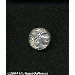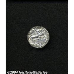 <B>C. Vibius C. f. Pansa.</B></I> 90 B.C. AR denarius (17 mm, 4.01 g). Laureate head of Apollo right; S(?) before / Minerva driving galloping quadriga right. Crawford 342/5b; Sydenham 684; Vibia 1. XF, sharp strike, peripheral toning. <BR><BR><B>Important notice:</B> Heritage usually auctions material at the rate of 200-250 lots per hour. On some occasions eBay Live bid software or the Internet may not be able to keep up with the pace of the auction. We recommend placing a realistic absentee bid now as insurance to avoid disappointment. Occasionally the auctioneer may eliminate or reject an eBay Live bid, and the auctioneer may also reopen a lot after the close of the eBay live bidding (usually because we missed an audience bid), and may reject your bid even if it shows you as the winning bidder. By bidding via eBay Live, you agree that Heritage may award the lot to another bidder at its sole discretion under the circumstances described above or any other reasonable circumstances. Since eBay bids are not shown to us until we open the lot on the floor, we treat those bids just like floor bids. In most cases the floor responds before the eBay bid is presented to us, due to Internet lag time, so for consistency we have made it a policy that floor bids are always considered first over tie eBay live bids. Also please note that all Heritage lots purchased through eBay Live carry a 20% Buyer's Premium. Please make sure you read the Terms and Conditions before you bid.