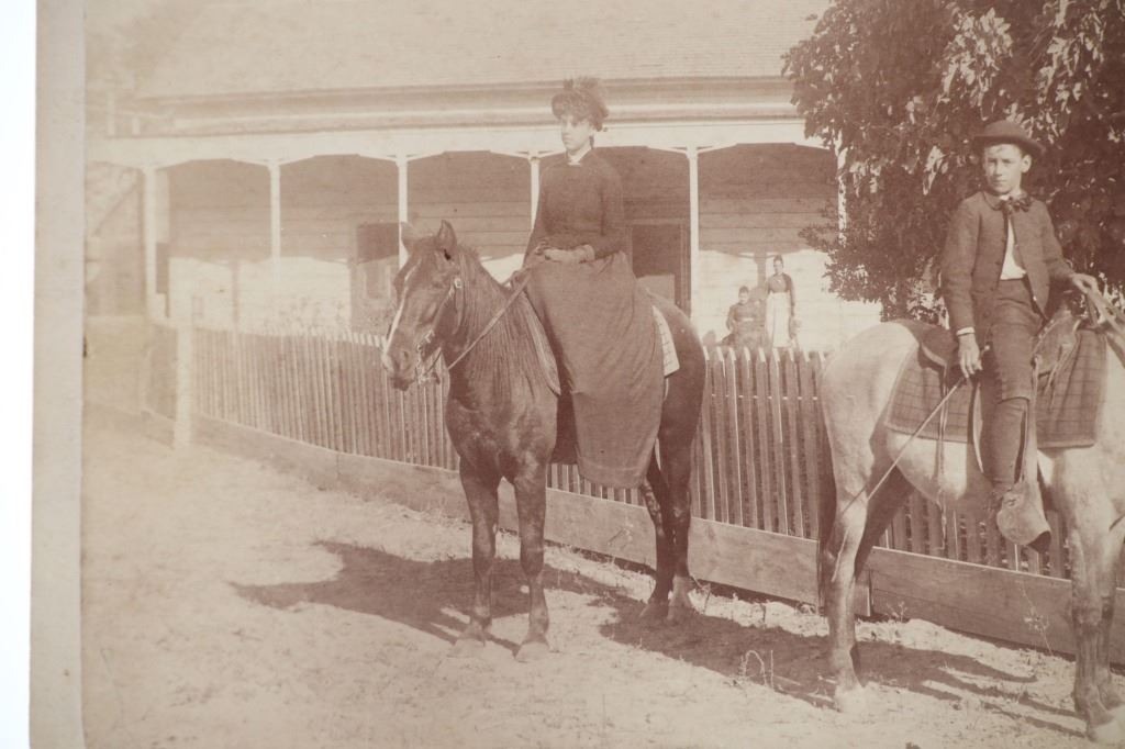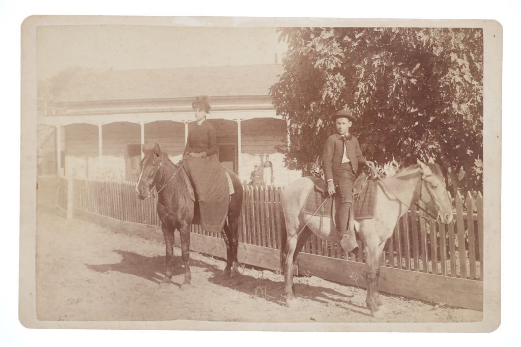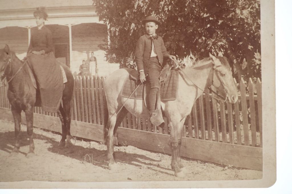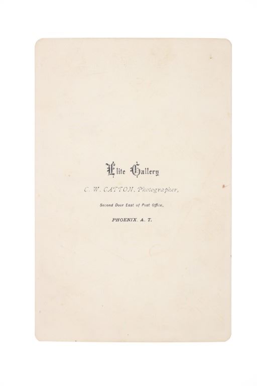 Featured in this lot is this C.W. Catton, Elite Gallery, Phoenix, Arizona Territory cabinet card circa 1880's and was housed in the Tombstone Western Heritage Museum; Provenance: From the Tombstone Western Heritage Museum in Tombstone, Arizona. The cabinet card features a wonderfully and professionally crafted cabinet card that shows a photograph of a young woman and young man on horseback posing outside of a fenced house. The back of the cabinet card is marked as follows: Elite gallery - C.W. Catton, Photographer, Second Door East of Post Office, Phoenix, A.T. The condition of this cabinet card is well preserved with some browning to the cardstock and the photograph itself but otherwise shows a well preserved condition. The measurements of this cabinet card is 4 1/4" x 6 1/2". The collective weight of this cabinet card is U4oz.
