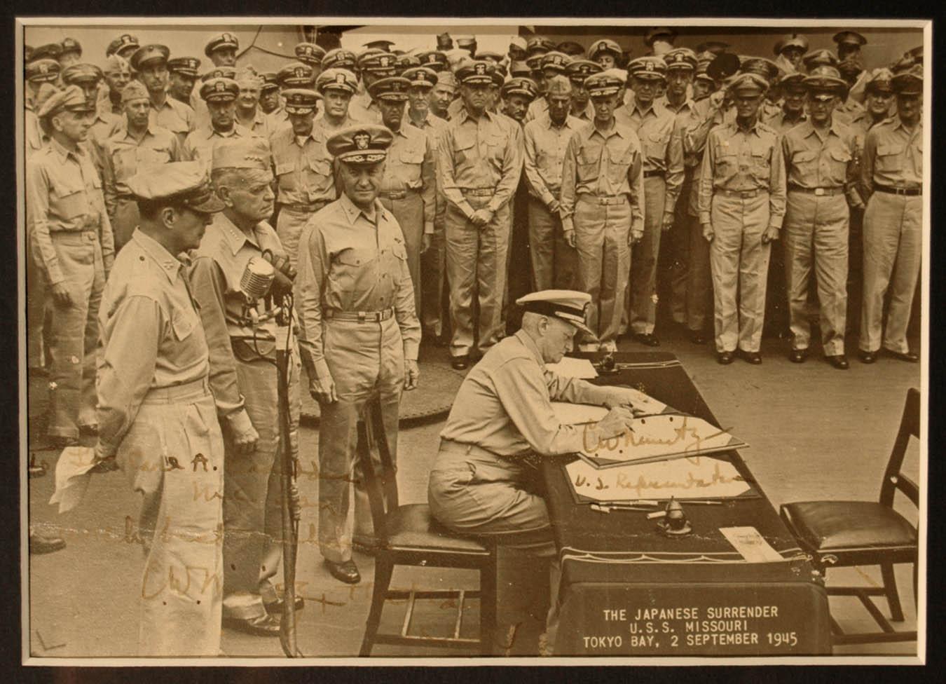 Admiral C.W. Nimitz twice-signed World War II Japanese surrender photograph. Two ink inscriptions read, ''CW Nimitz US Representative'' and ''To Carl A Maddus with best wishes CW Nimitz.'' Also includes two World War II 4-Star admiral insignias. Photograph measures 7'' x 5''. Excellent condition.