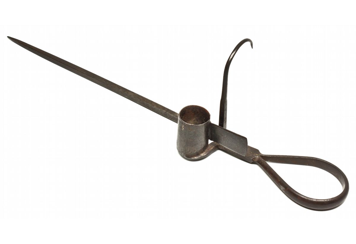 If you look at the thumb lever of this stick, you can see the name C. WHITNEY inscribed on the side. It is very possible that this candlestick belonged to Cornelius Vanderbilt Whitney, son of Gertrude Vanderbilt and Harry Payne Whitney. In 1919 H.P. was approached by 2 young mining inventors interested in expanding and developing the South end of the Comstock. Ray Hardy and Alex Wise saw the area to be a promising mining investment and they contacted H.P. to be investor in helping to acquire different mines in the area. “In 1920 the United Comstock Mines Co. was organized as a subsidiary of Harry Payne’s Metals Exploration Co.” Major players of the mining community like Roscoe Channing, became members of the board for this new company. Shortly after graduating from Yale in 1922, the young C.V. Whitney moved to Nevada and took up a job as an underground mining sampler for one of the mines. Although the idea seemed promising, the ore proved to be an issue. It was extremely sticky and required more labor then was anticipated, causing business costs to rise. In addition, silver dropped from $1 an ounce in 1920 to 67c in 1924. The parent company, Metals Exploration Co., decided to move operations to Canada. The new company was named the Hudson Bay Mining and Smelting Co. Limited. C.V. served as served as chairman of the board until 1964. The stick measures about 13.” Some wear, but overall in very good condition. RCS 14. Not in Wilson [REF: Cornelius Vanderbilt Whitney, Encyclopedia Britannica Online, 2012], [Ref: The History Of The Comstock Lode, Grant Horace Smith and Joseph V. Tingley, 1994, pp 290-3]. - Ken & Rosemary Roberts Collection -59314