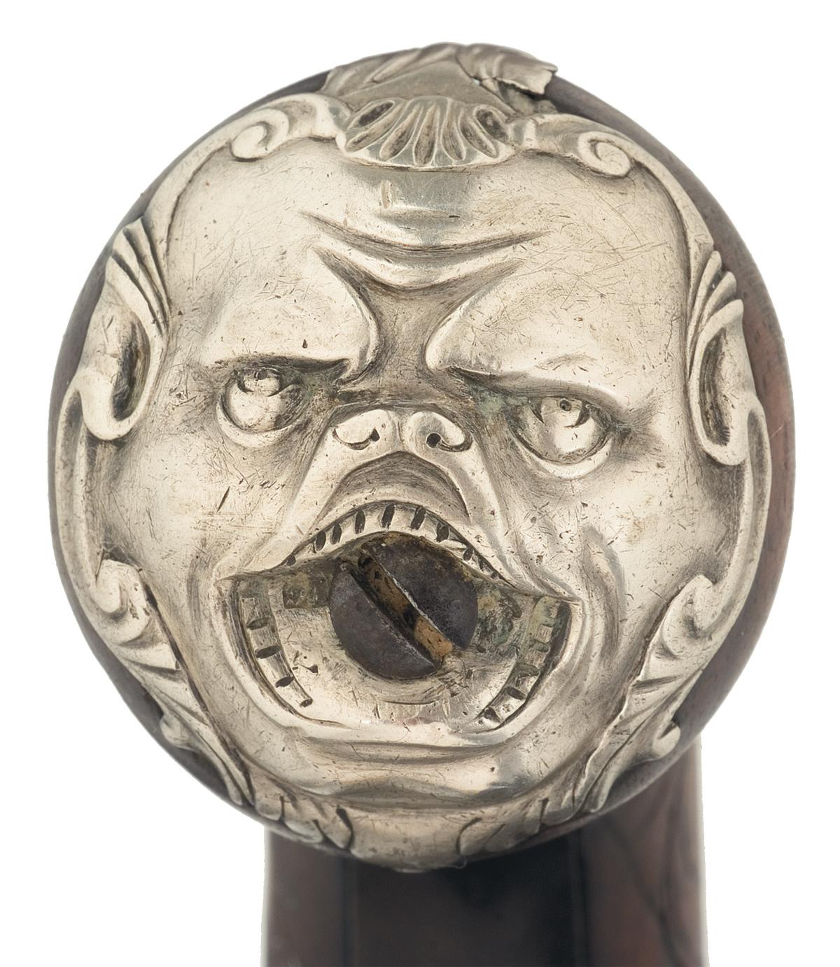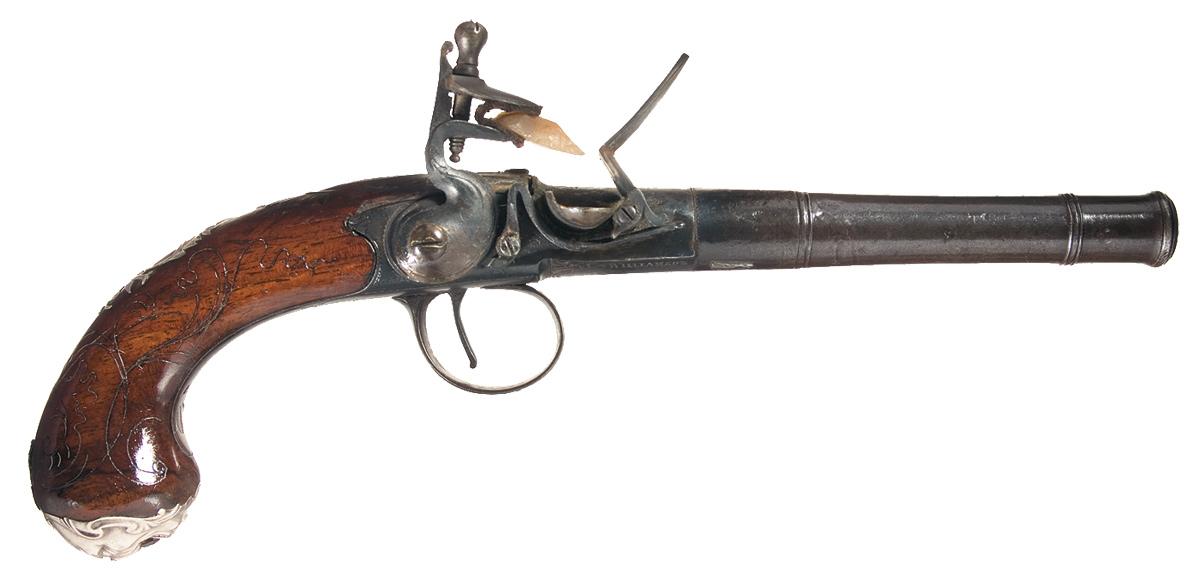 This particular Queen Anne pistol maker has the unusually shaped frizzen spring behind the pan. The position of C. Williamson's maker marking, below this frizzen spring is low on the frame. In addition to the "C * WILLIAMSON" marking, there are three recessed proofs "crown / P", "TH" and "crown / V" directly ahead of the trigger guard. The barrel is tapered with a cannon muzzle and floral engraving at the breech end. The iron trigger guard has a simple engraved design. The grip features silver wire inlays and silver overlays with a grotesque face on the butt.