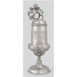 Németország, 1775, ón, vésett díszítéssel, fedelén "Sebastian Maihir" felirattal, m: 38 cm