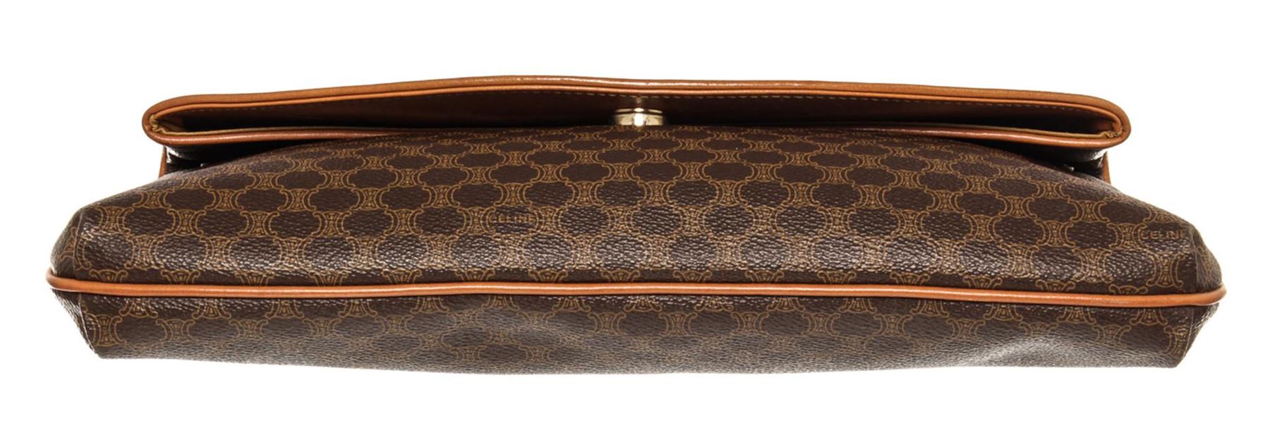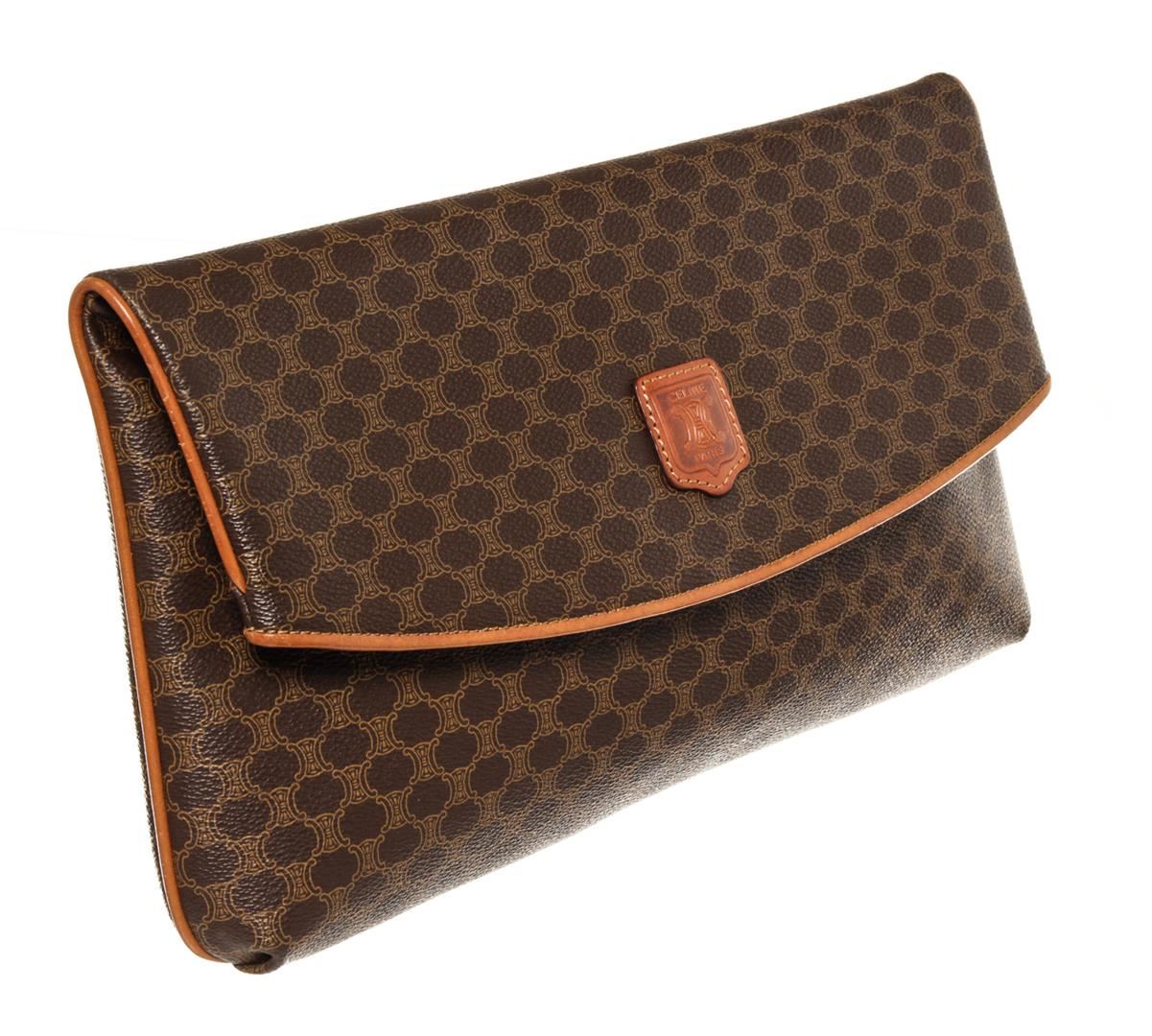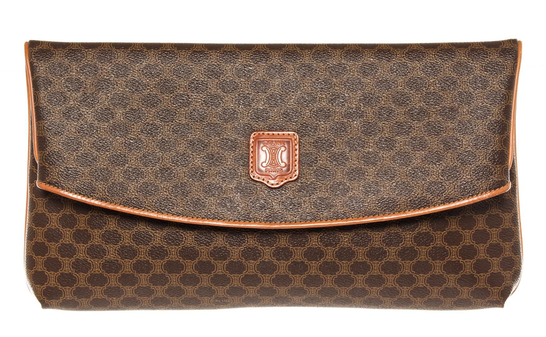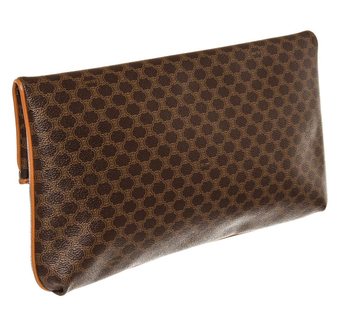 This Celine Macadam clutch bag features a brown monogram coated canvas body with tan leather trim, a fold over top with a magnetic snap button closure, brown leather lining and an interior zip pocket. 12.59"L x 7.87"W x 1.57"H