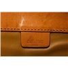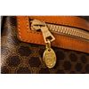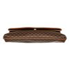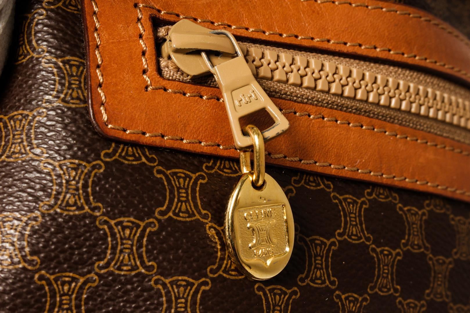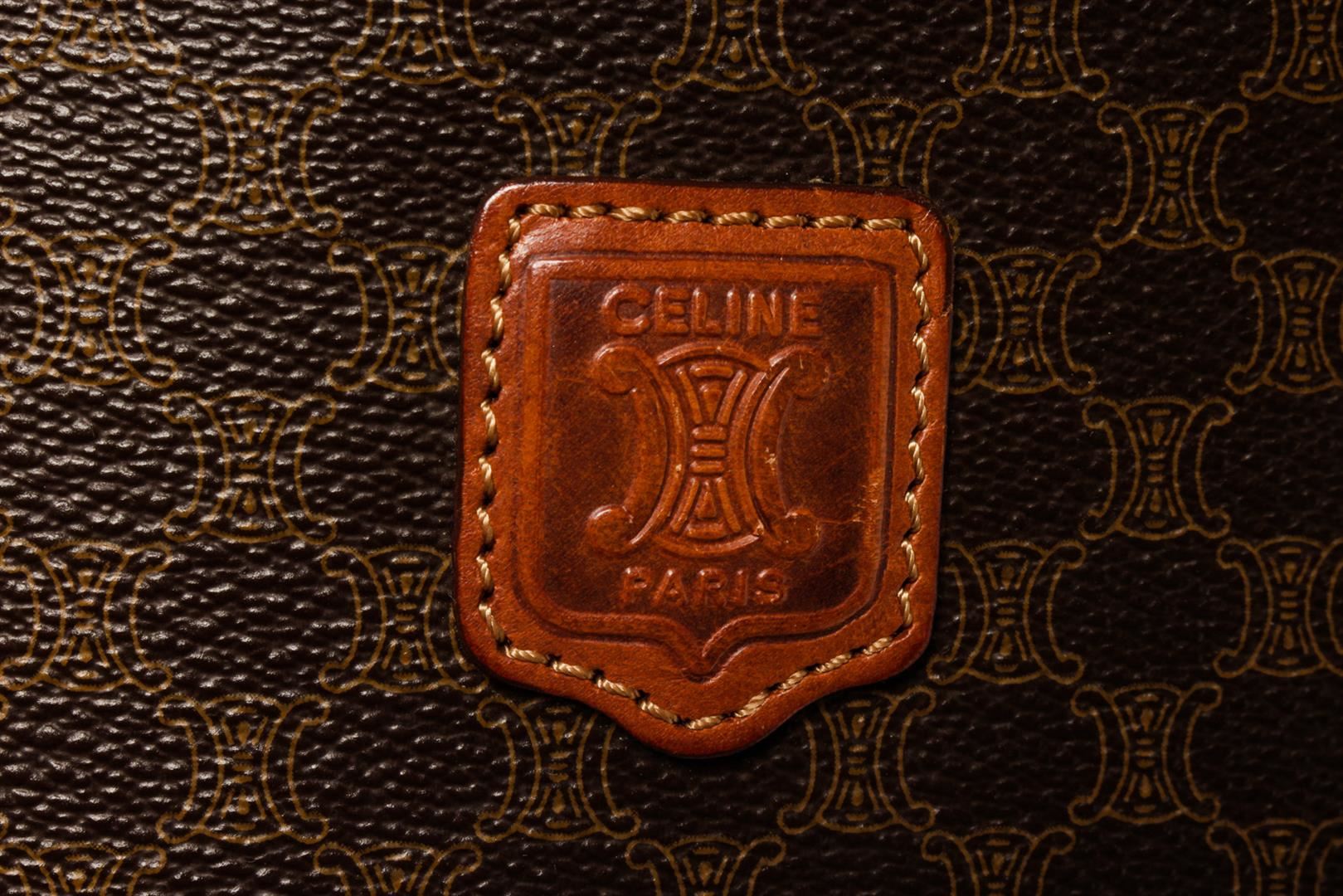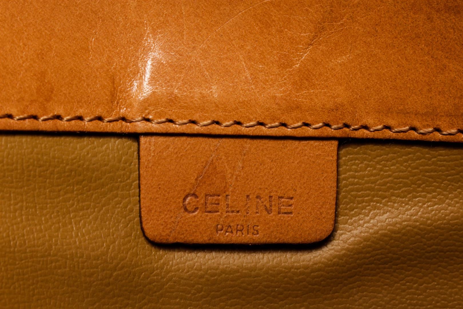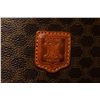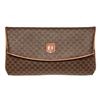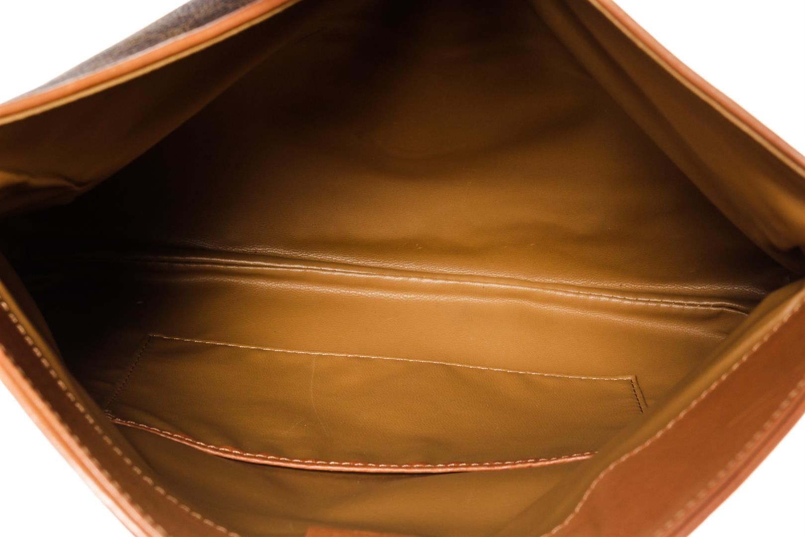 This Celine Macadam clutch bag features a brown monogram coated canvas body with tan leather trim, a fold over top with a magnetic snap button closure, brown leather lining and an interior zip pocket. 12.59"L x 7.87"W x 1.57"H