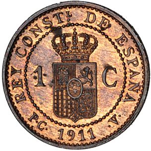Céntimo. 1911 *1. Madrid. PCV. VII-128. R.B.O. en el anv. y B.O. en el rev. EBC+. Escasa.
