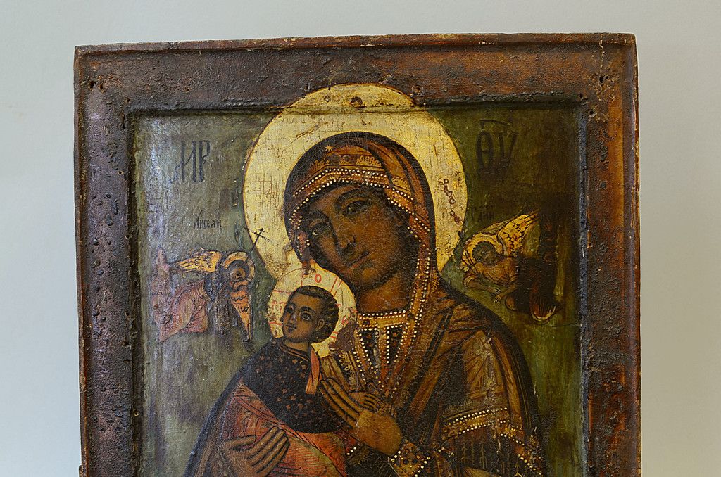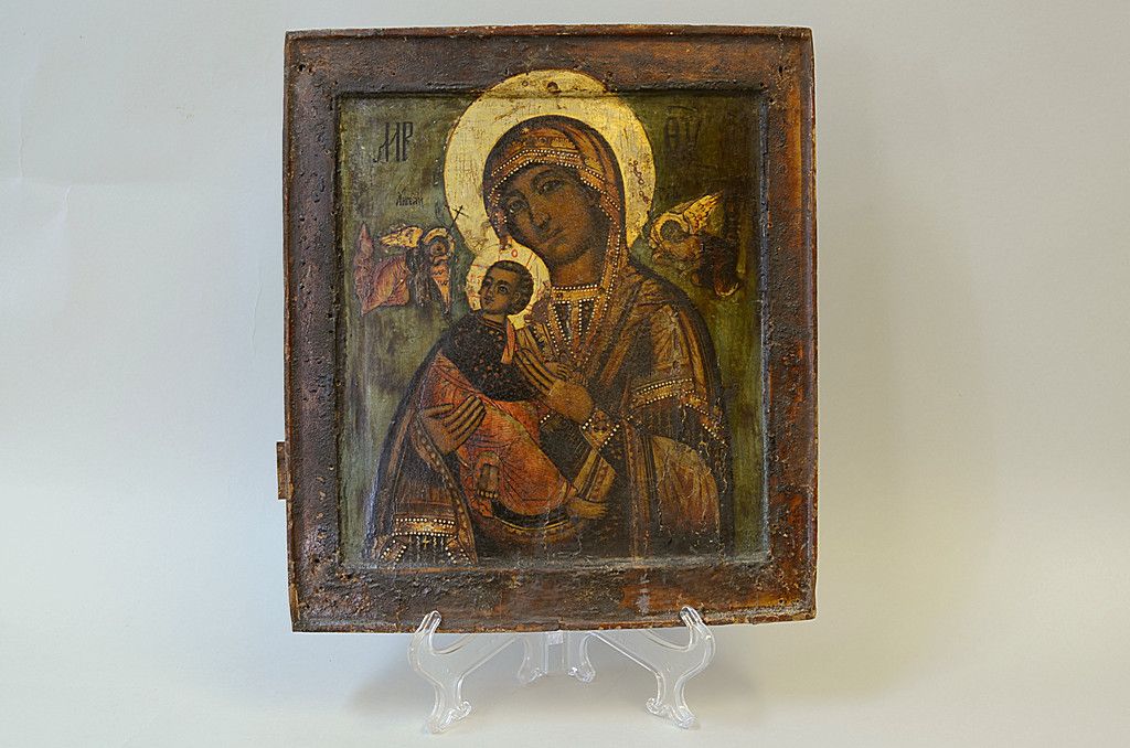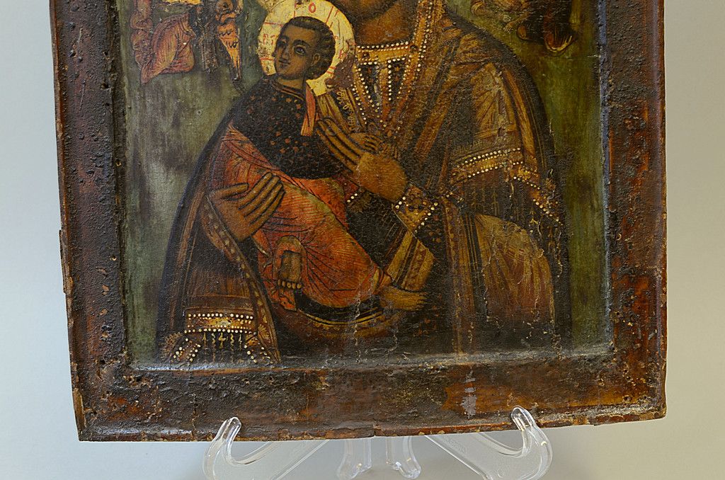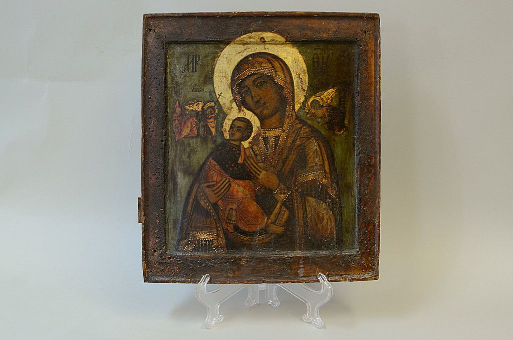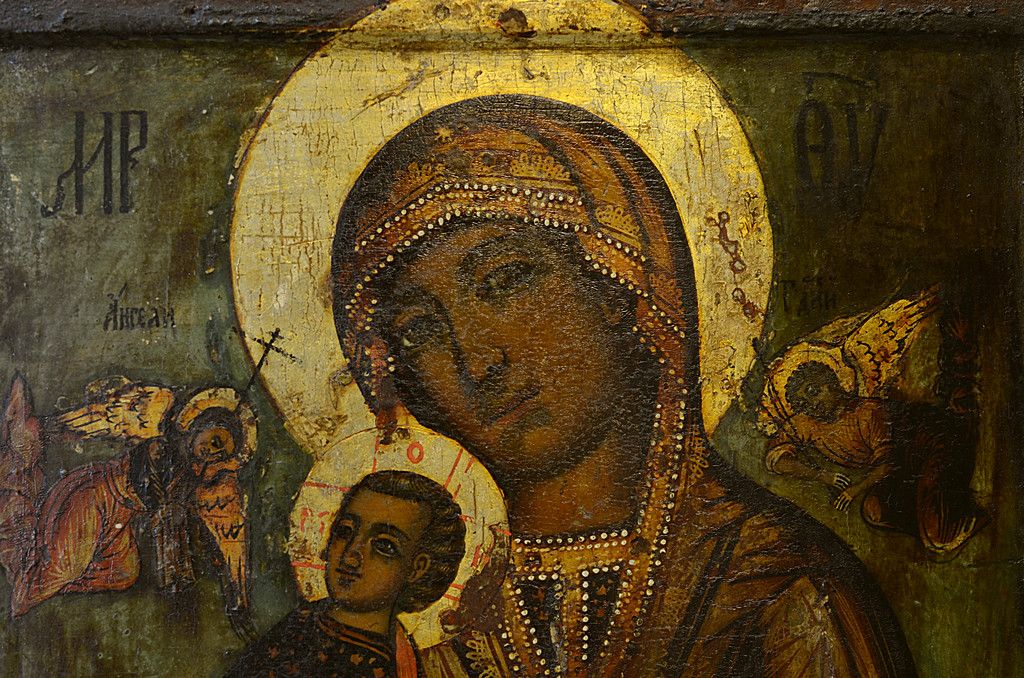 C1860 Antique Russian Icon - Madonna Surrounded by Angels. Painted on wood plank.