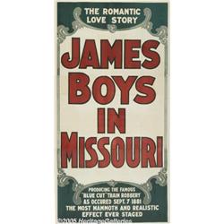<B>The James Boys in Missouri (Winterburn Show Printing, c.1890)</B></I> Theater Poster (41" X 81"). A large format (41 x 81) theatrical broadside, this poster advertises one of the war horses of the touring circuit. Memories of the lawless West were still fresh in American minds and legends had started to accumulate. Contributing to the excitement generated by the play was the history of Jesse James and his gang, his dramatic death and the fact that each time the play was presented a rumor was spread that one of the cast members was the man who shot Jesse James. Very Fine condition on Linen.