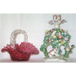 C18th Derby porcelain 'patch mark' period fable candlestick, modelled as two birds nesting amongst bocage, with a dog below, nozzle re-stuck with additional collar, circa 1765, 8.5ins. high (see illustration). Reference - Gilbert Bradley 'Derby Porcelain 1750-1798', p.71, for a similar candlestick. Est.£100/150