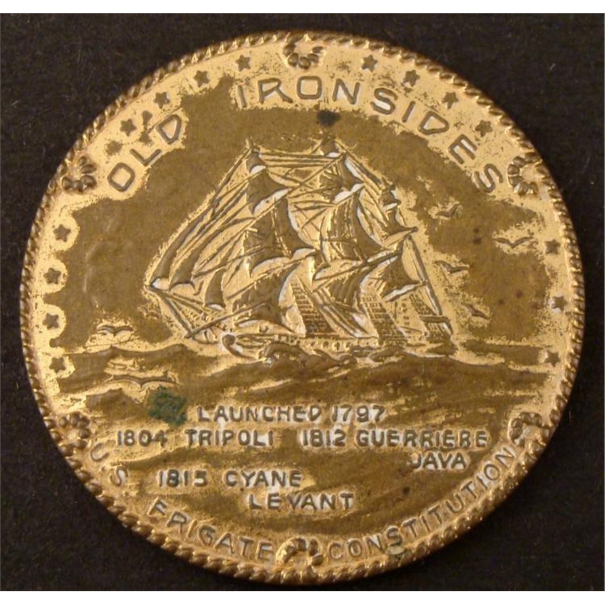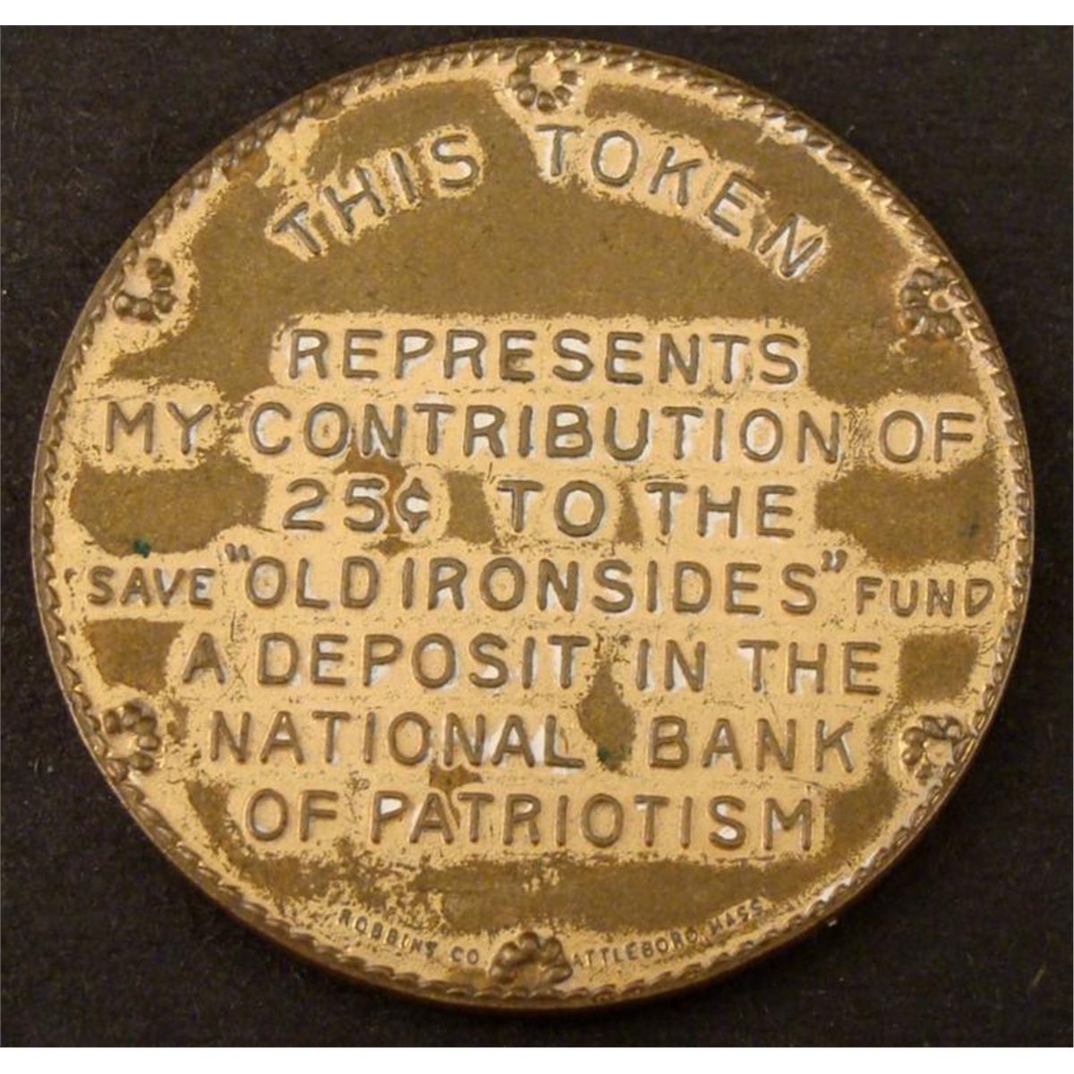 OFFERED HERE IS A C1900 COIN MEDALLION-25 CENT CONTRIBUTION TO "OLD IRONSIDES" FUND. * THE COIN SHOWS OLD IRONSIDES ON THE FRONT WITH THE MAKER'S0 MARK "ROBBINS CO". THE DIAMETER IS 1 1/4". *
