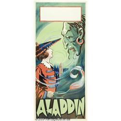 <B>Aladdin (Circa 1920)</B></I> Theatrical Poster (39" X 79"). The British Pantomime (or Panto) tradition, which is still going strong, involves a comic rendition of a legend, fairy tale or even an early Disney animated film. They are put on during the Christmas season. There are many traditional lines, which draws traditional responses from the audience of adults and children (much like an early midnight showing of Rocky Horror Picture Show.) There are many horrible puns, cross dressing, double entendres and broad Benny Hill type humour. The story of Aladdin is still a popular Panto theme and this poster was designed to be used by provincial performing groups with a blank space to fill in the name of the theatre and the playdates. Fine/Very Fine condition on Linen.