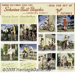 <B>Schwinn-Hollywood Stars (Circa 1941)</B></I> Advertising Poster (27" X 25"). This promotional poster was sent to Schwinn dealers for posting in their shops. While the studios, who had movie stars under contract, would force them to endorse many products for a pittance, as long as the name of a film was mentioned, this is a case of the stars themselves offering their images in return for bikes for the entire family. Among the herd of Hollywood hustlers was a small group of product agents who would offer all types of merchandise to movie stars in exchange for a brief photo session and an endorsement. Some of the stars featured: Dorothy Lamour, Rita Hayworth, Buck Jones and Bing Crosby. Rolled, Very Fine condition.