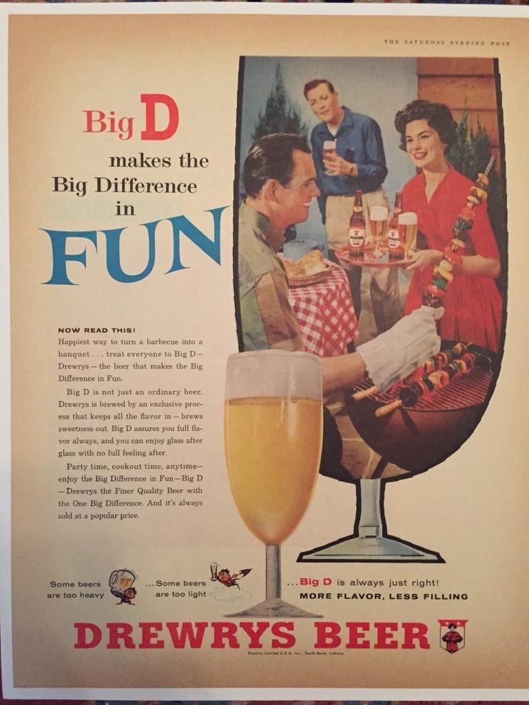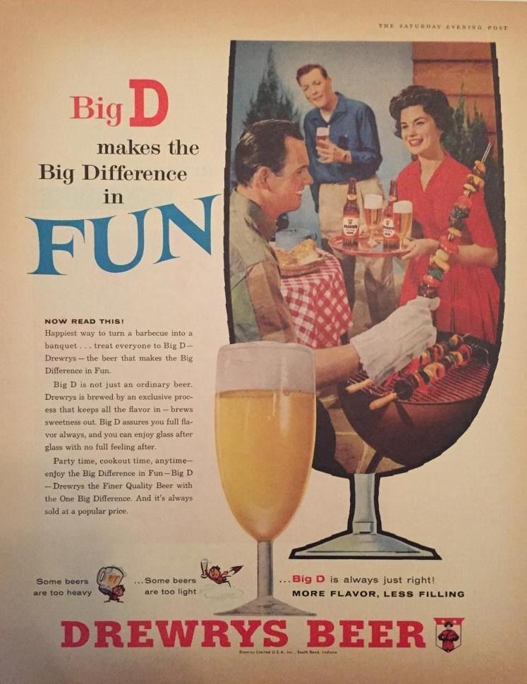 Original c1960 magazine advertisement from The Saturday Evening Post, for the South Bend, Indiana brewery Drewrys Beer. Slogan reads, " Big D makes the Bid Difference in Fun". 1- 1/2" X 13 1/2". Mounted on archivallinen canvas for preservation.