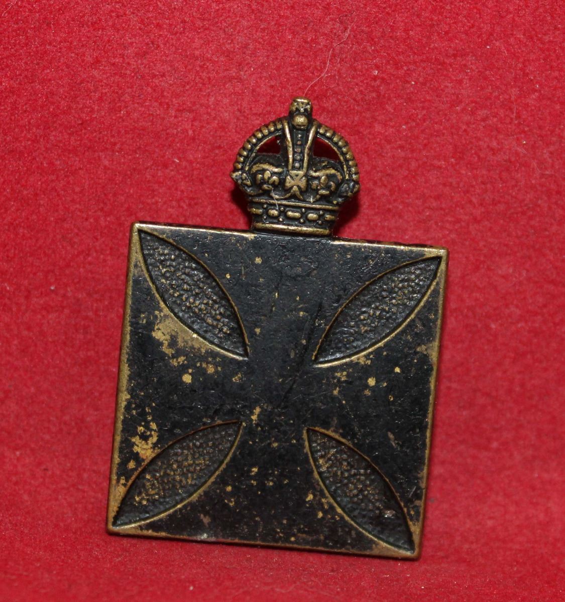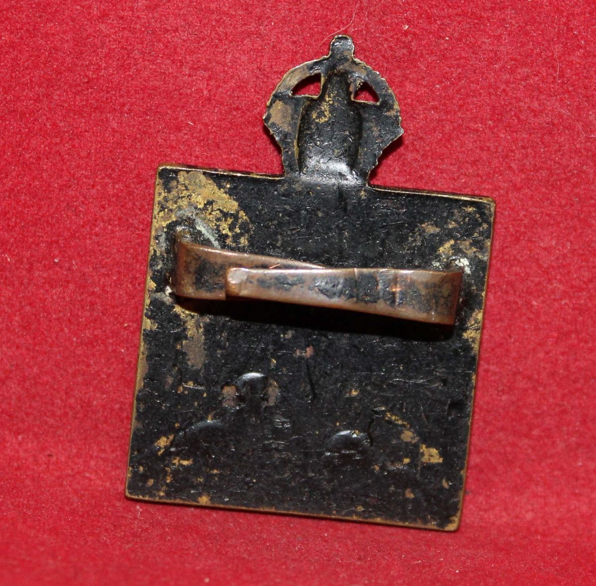 Brass metal, with black coating, with some areas of brass showing due to wear. This is the type with the Kings Crown over a square base, the base of the crown on this one is narrow, 7 41mm wide, with the square being 29.26mm per sides, folding type fasteners. This design on badge worn by several Commonwealth countries beside Canada. Babins 39-10A.