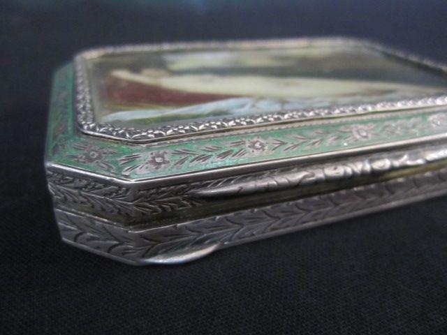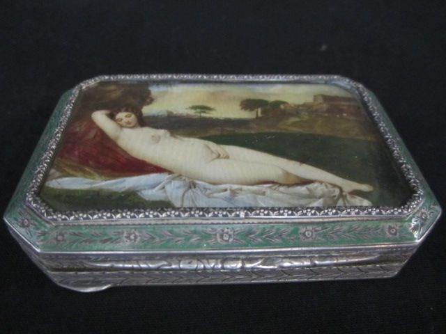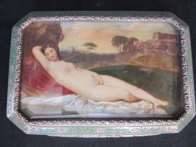 With hand painted ivory of reclining nude. Perfect condition. Measures 1" tall x 3 1/2" x 2 1/2". Estimate $800 - $1,200
