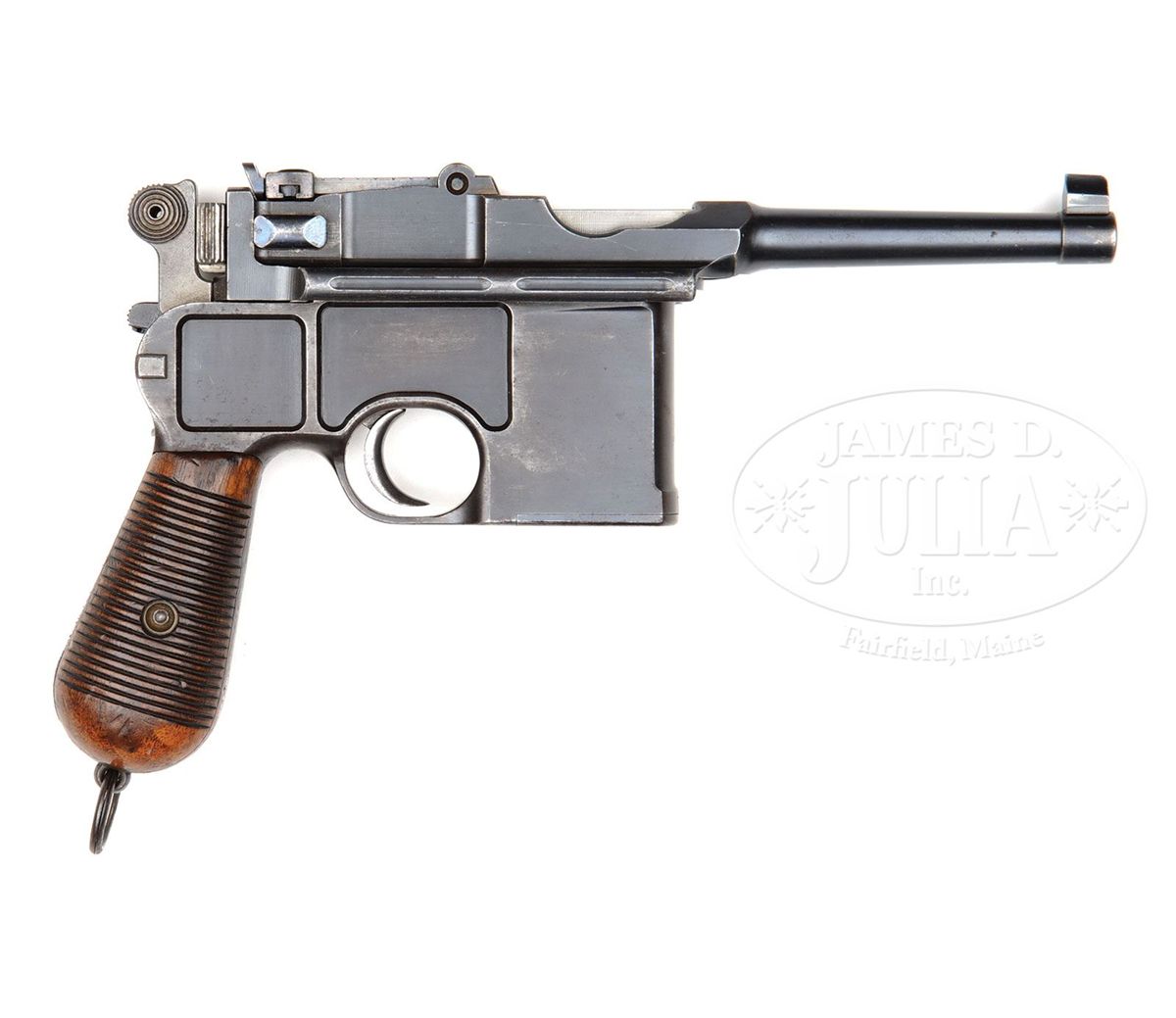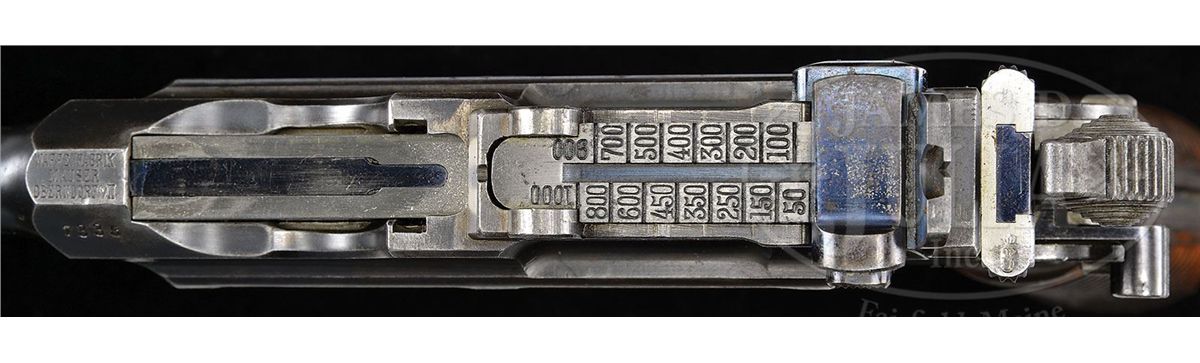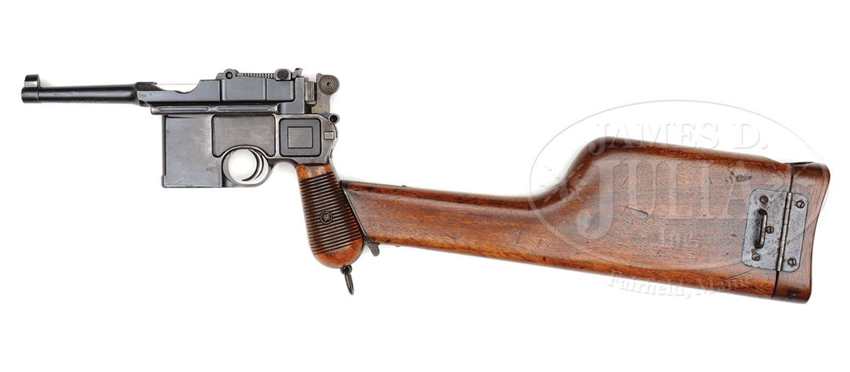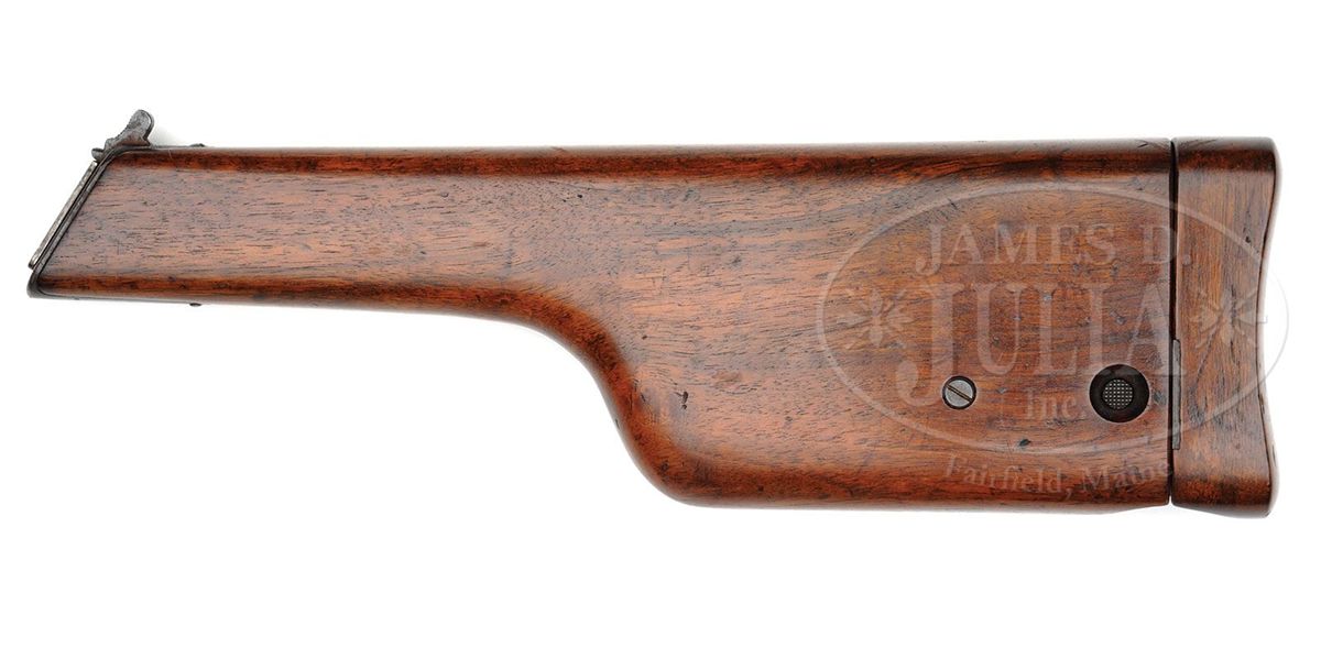 SN 7335. Cal. 7.63mm. Scarce Conehammer reworked to have a later type bbl assembly with a 4" bbl and 50-1000 rear sight. Standard chamber address and full SN on the left chamber flat. Small Crown/Crown/U mark on the left side of the bbl extension. No proofing on the right side. Long extractor and independently dovetailed block retained firing pin. Full SN is externally marked on the firing pin retainer, on the back of the hammer and on the back of the frame above the stock slot. The sight assembly is a replacement #660. All matching serial numbers on disassembly except for the locking block which is unnumbered. Original and fully numbered grips. Lanyard ring. Complete with correct and factory matching conehammer shoulder stock. PROVENANCE: Dr. Geoffrey Sturgess Collection. CONDITION: 75-80% original blue with thinning on the sides of the frame, under the trigger guard, and the front and back straps that have mellowed to a brown patina. The extractor, rear sight assembly, bolt stop, firing pin retainer, and safety have their original and comparable condition fire blue. Grips with comparable condition varnish and oil staining. Dull bore with shallow rifling and oxidation from corrosive ammunition. Perfect mechanics. Stock is oiled and may have been lightly sanded. Single hairline crack in spine, near hinge, nearly invisible. Hinge has considerable surface toning. Untouched lug with sharp, matching numbering. A very scarce and difficult to find Conehammer, particularly with a factory matching stock. 4-52085 LMA83